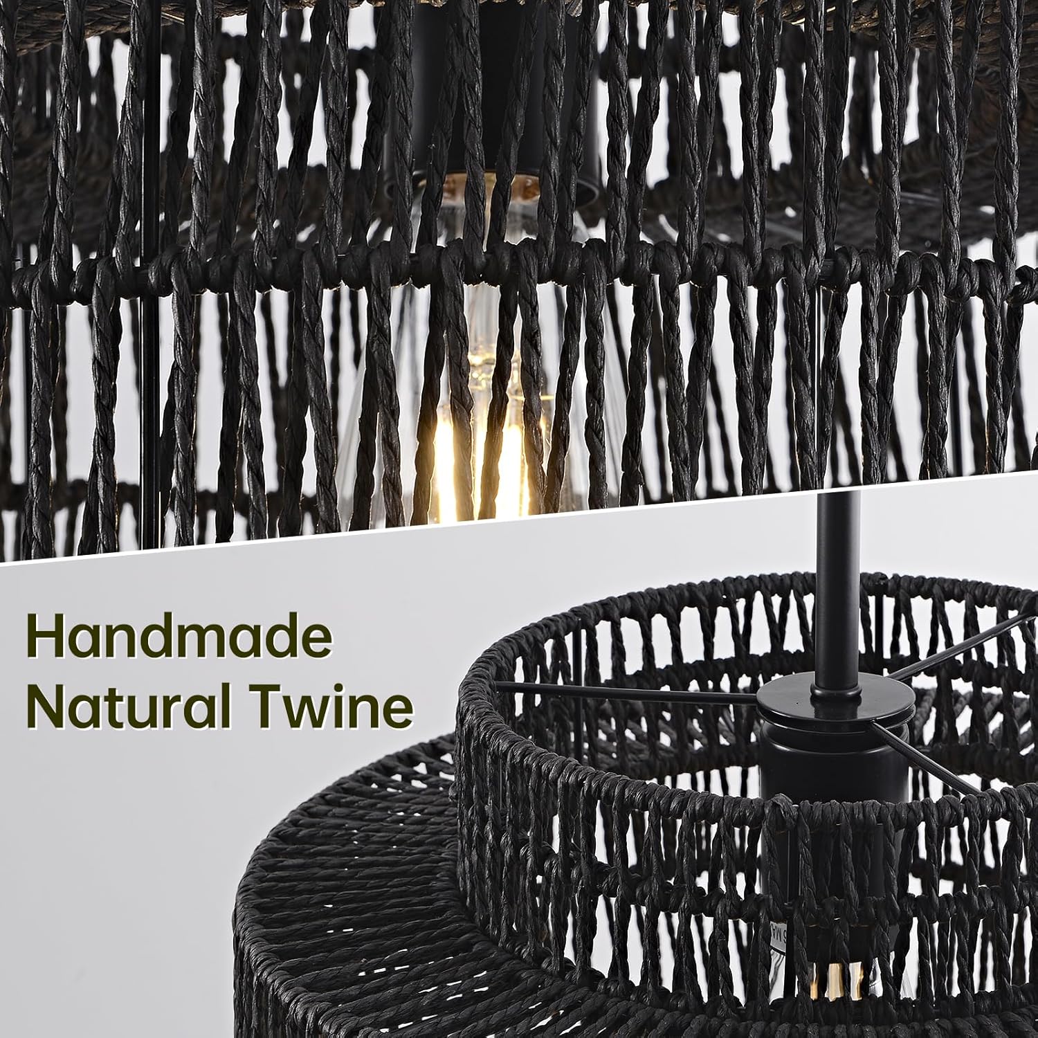 12.4” Black Boho Rattan Chandelier Light Fixture, 1-Light Hand Woven Pendant Light Fixture Farmhouse Rustic Hanging Lamp for Kitchen Island Bedroom, Dining Room, Living Room, Entryway, Foyer