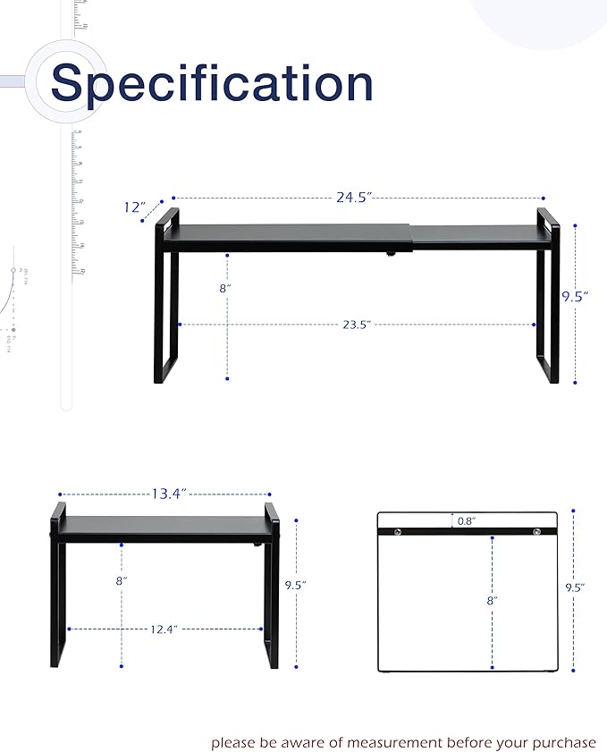 • EXPANDABLE: You may expand the width of this freestanding cabinet shelf to your desires. It can easily vary from 13.4 inches to 24.5 inches in width depending on how you want to organize your space. Specification: 12’’D * 13.4-24.5’’W * 9.5’’H
