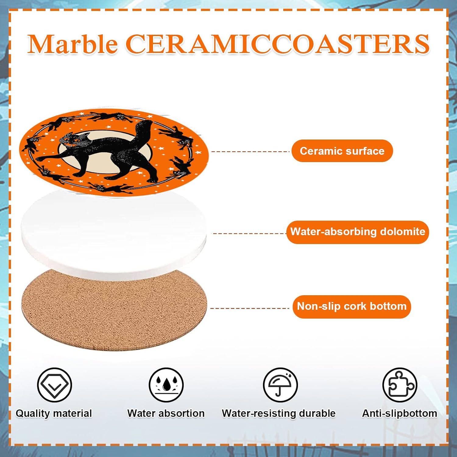 • DELICATE DESIGN: Our coasters are Halloween themed, taking orange as the background color, patterned with black cats, vintage and eye-catching, which will be the perfect complement to your Halloween and everyday table decor.