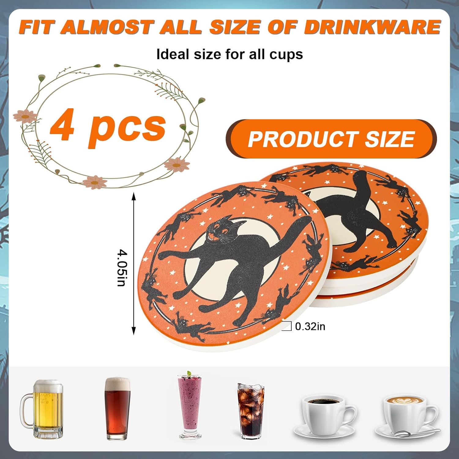 Generic AnyDesign 4Pcs Halloween Coasters Black Cat Ceramic Drink Coasters Vintage Cup Mats for Home Kitchen Table Protection Housewarming Gift
