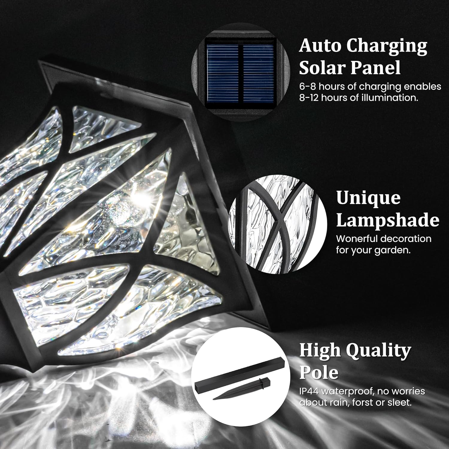• 【Efficient Solar Power】Equipped with upgraded solar panels, our outdoor lights are more efficient than other solar lights on the market. This ensures that you have the desired brightness effect and lighting duration. Additionally, we have used high power LED lamp beads and a high transmittance lampshade to ensure that our solar lights are brighter than ordinary solar lights for outside