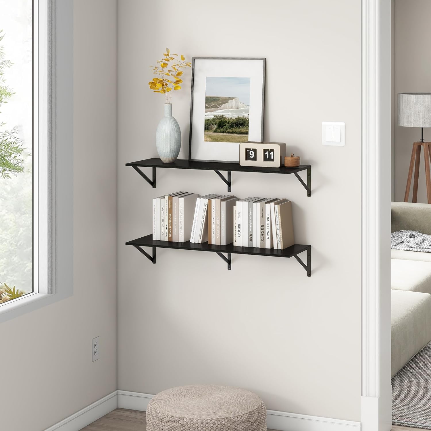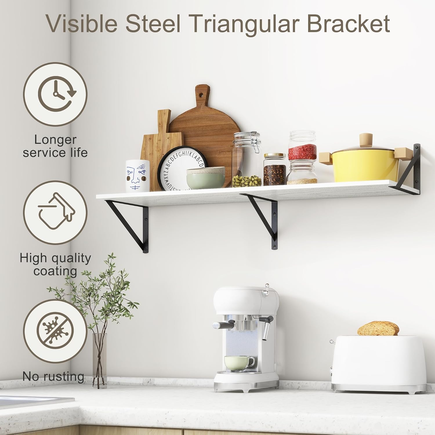 • 【FARMHOUSE RUSTIC WALL SHELF】These floating shelves are made of premium engineered wood board and visible triangular bracket. The rustic wooden grain surface add character and warmth to any modern or traditional interior with these deep floating shelves, contrast shelves at staggering heights on the wall or mount side-by-side or in the corner for a clean streamlined look.