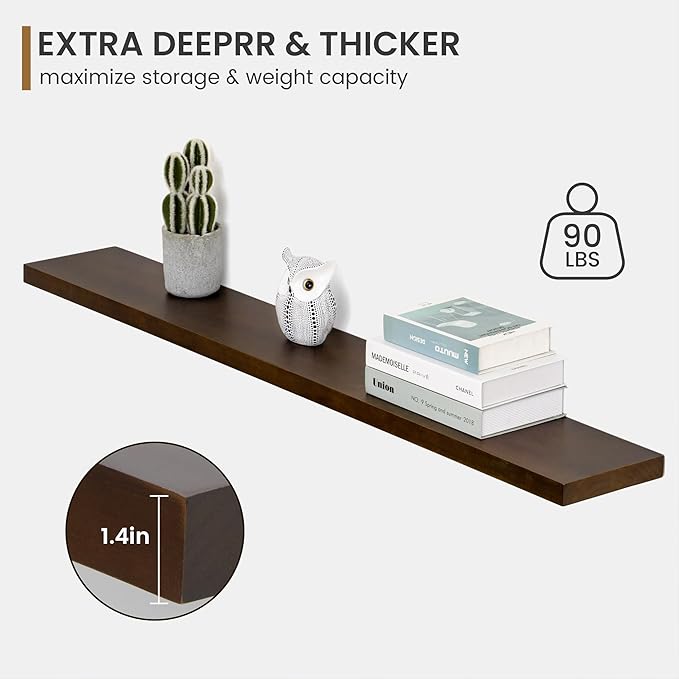 • Extra Deeper & Thicker for Storage - Each board measures 55"W x 8"D x 1.4"H. Extra deeper and thicker design in order to bring maximizes storage space and weight capacity, even hold up to 60 lb. This floating shelf taking up zero square feet, reduces clutter and highlights décor in compact spaces. It can help make full use of the empty wall, making it much more space-saving and making your room look larger and tidier.
