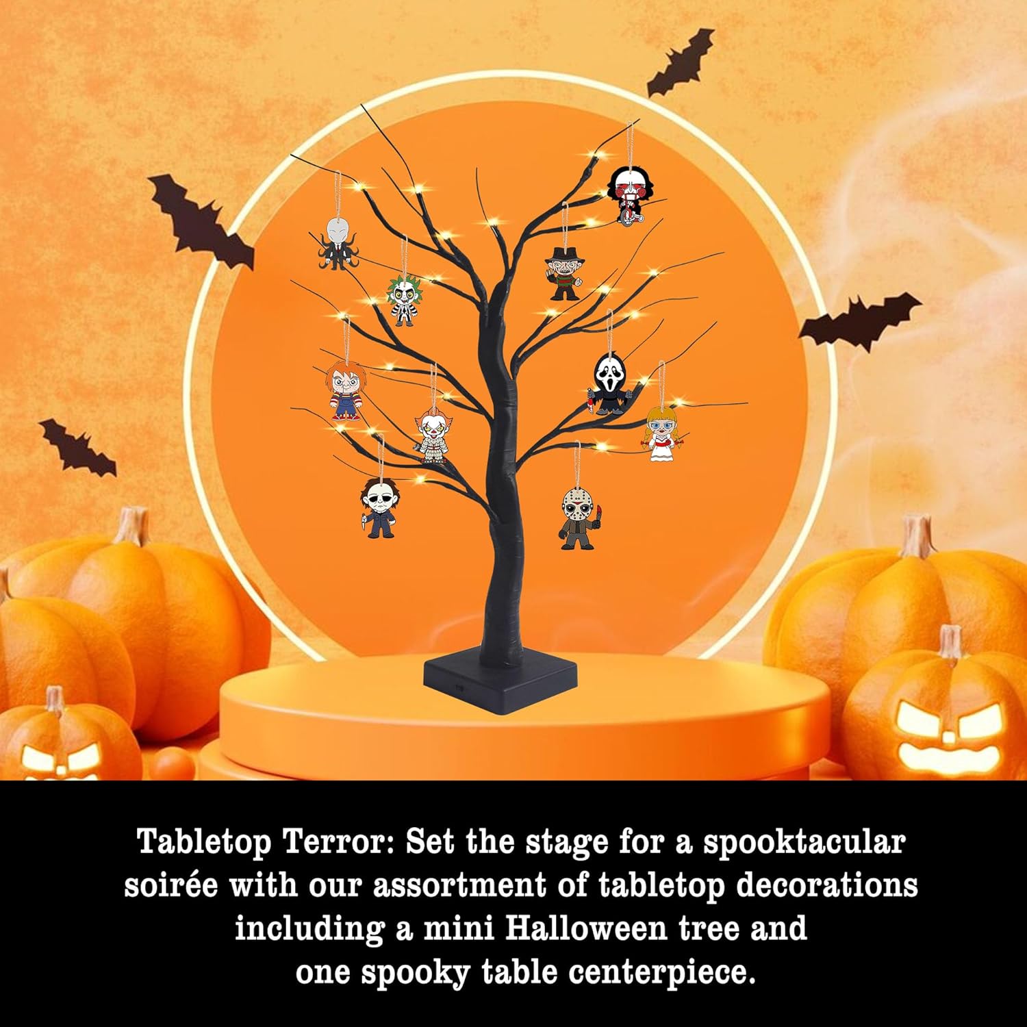 • Tabletop Terror: Set the stage for a spooktacular soirée with our assortment of tabletop decorations, including a mini Halloween tree and one spooky table centerpiece