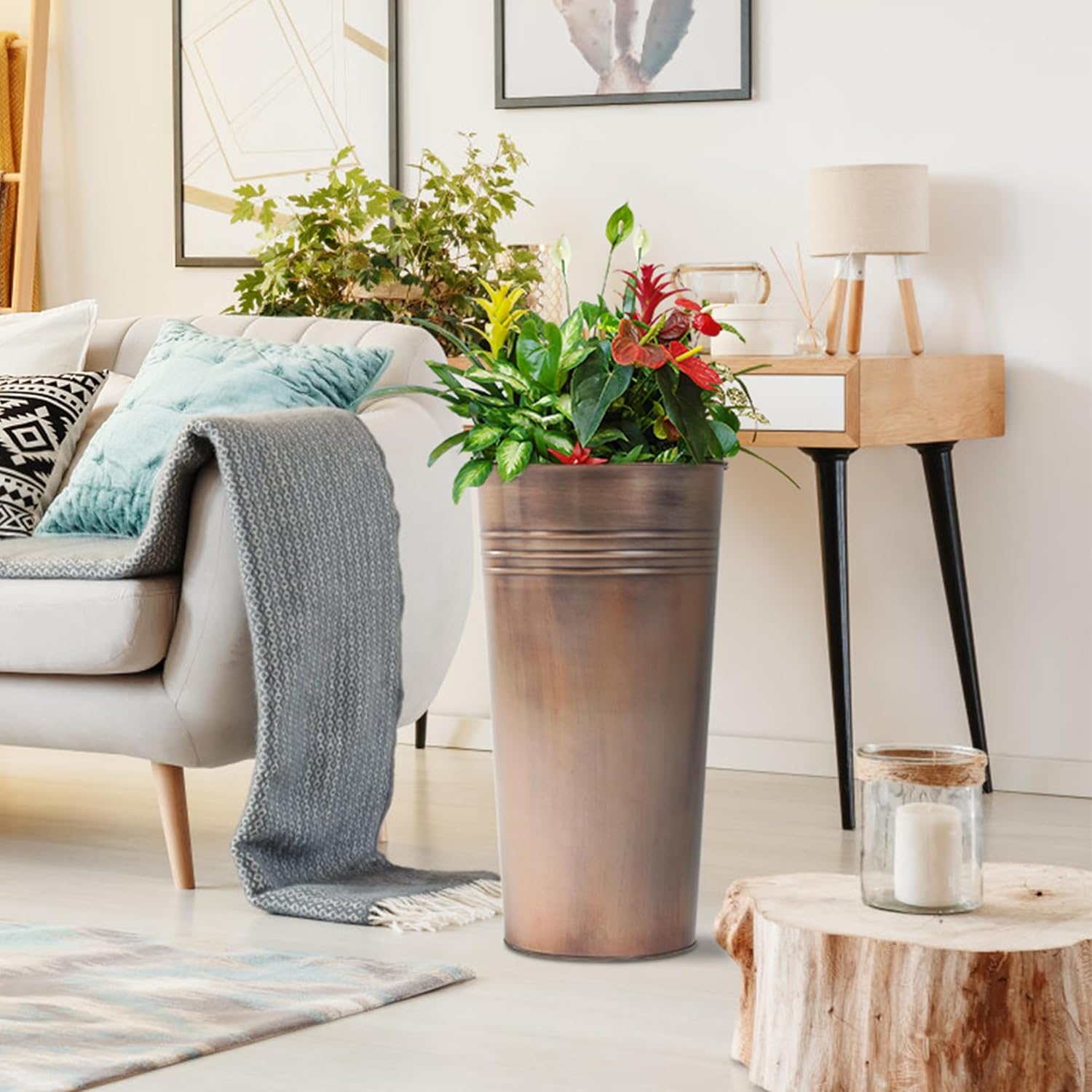 KOL 22''H 2-Pack Planter with Water Level Indicator - Galvanized Steel Pot - Self Watering Planters Flower Pot for Plant - Inner Pot Design - Round Metal Planter Box - Indoor Outdoor Planting - Bronze