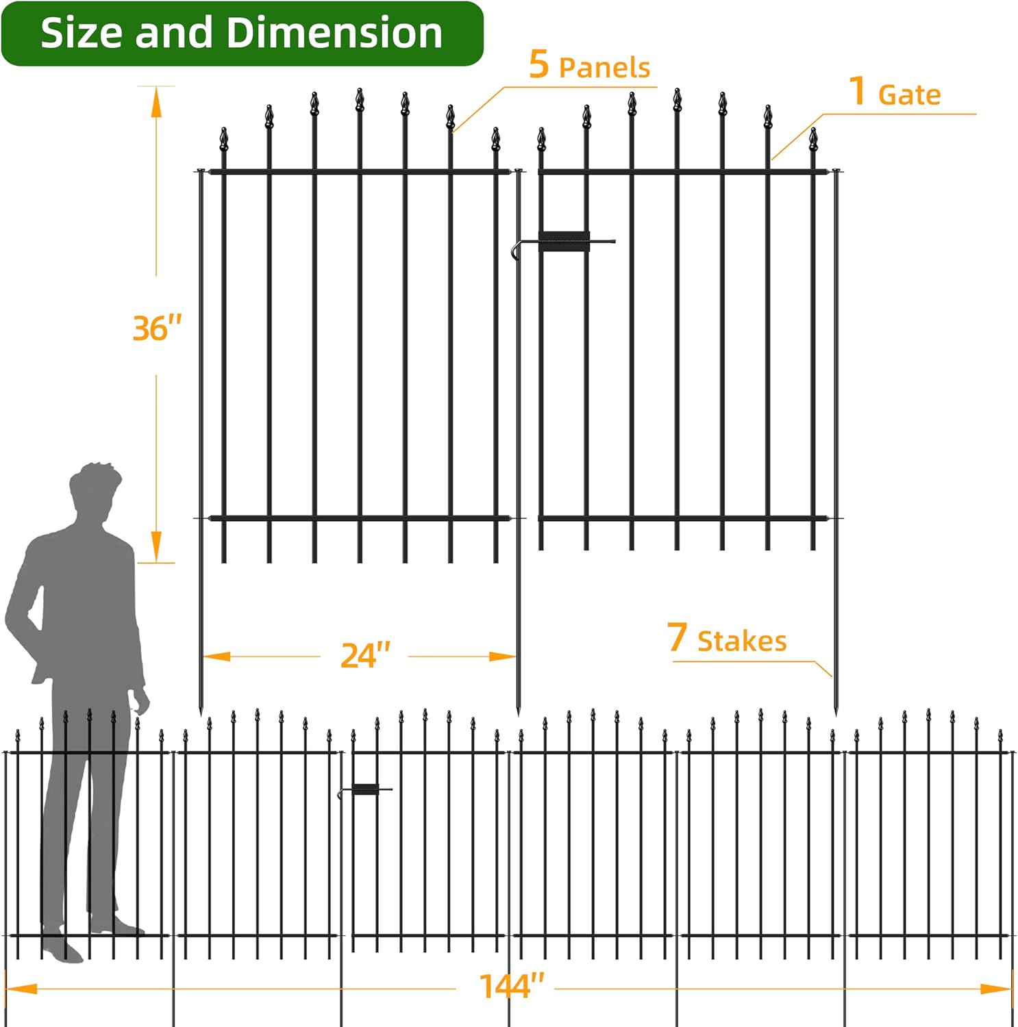 • WHAT'S INCLUDED: 1 Gate + 5 Panels + 7 Stakes in a bundle. Gate sized 35”(H) x 24”(W), each Fence Panel sized 36"(H) x 24"(W), each stake height 42 inch, the linear length 12 feet, Black color.
