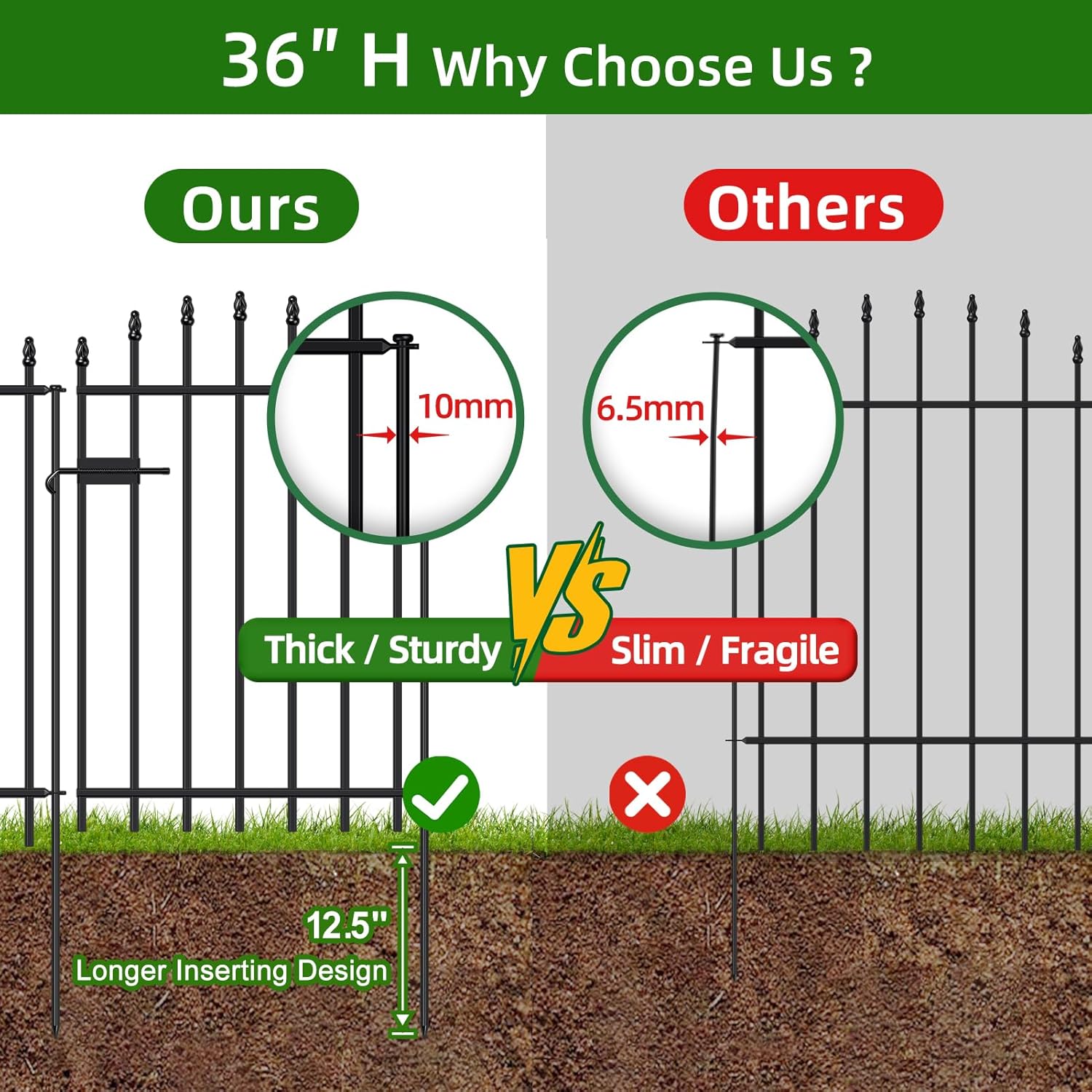 • ATTRACTIVE DESIGN: This 36 inch tall garden fence with black powder coated finish is durable for outdoor using, classically designed Roman Column decoration on arch patterns, which makes garden fencing more attractive.