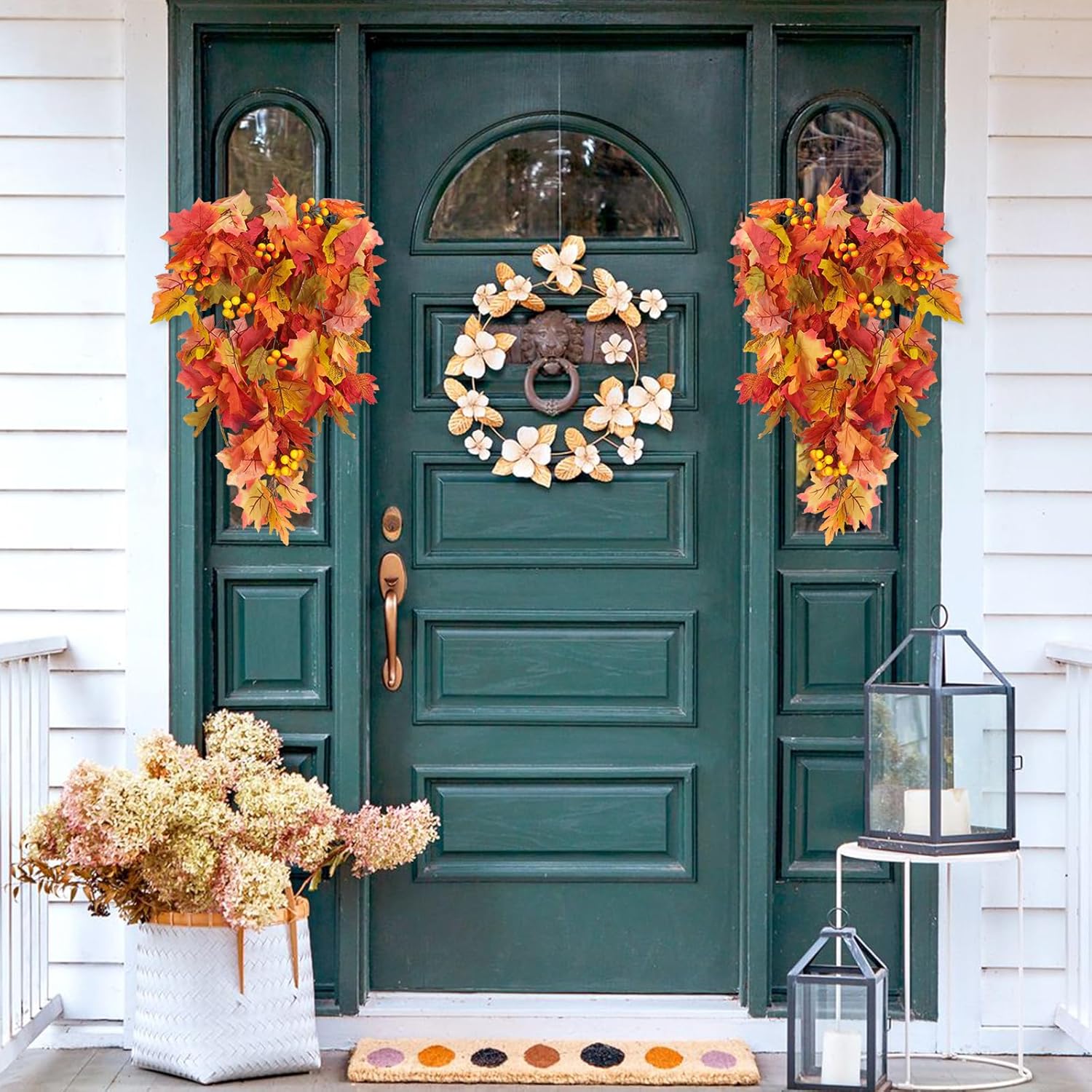 • [Material of Hanging Fake Maple Leaf] The fake maple leaf plants decoration is mainly made of quality silk cloth leaves with orange and green color,berry,detachable,durableand and the stem is embedded with iron wire inside,they have a realistic appearance and are close to nature .Faux maple leaves garland is perfect for indoor or outdoor decor.