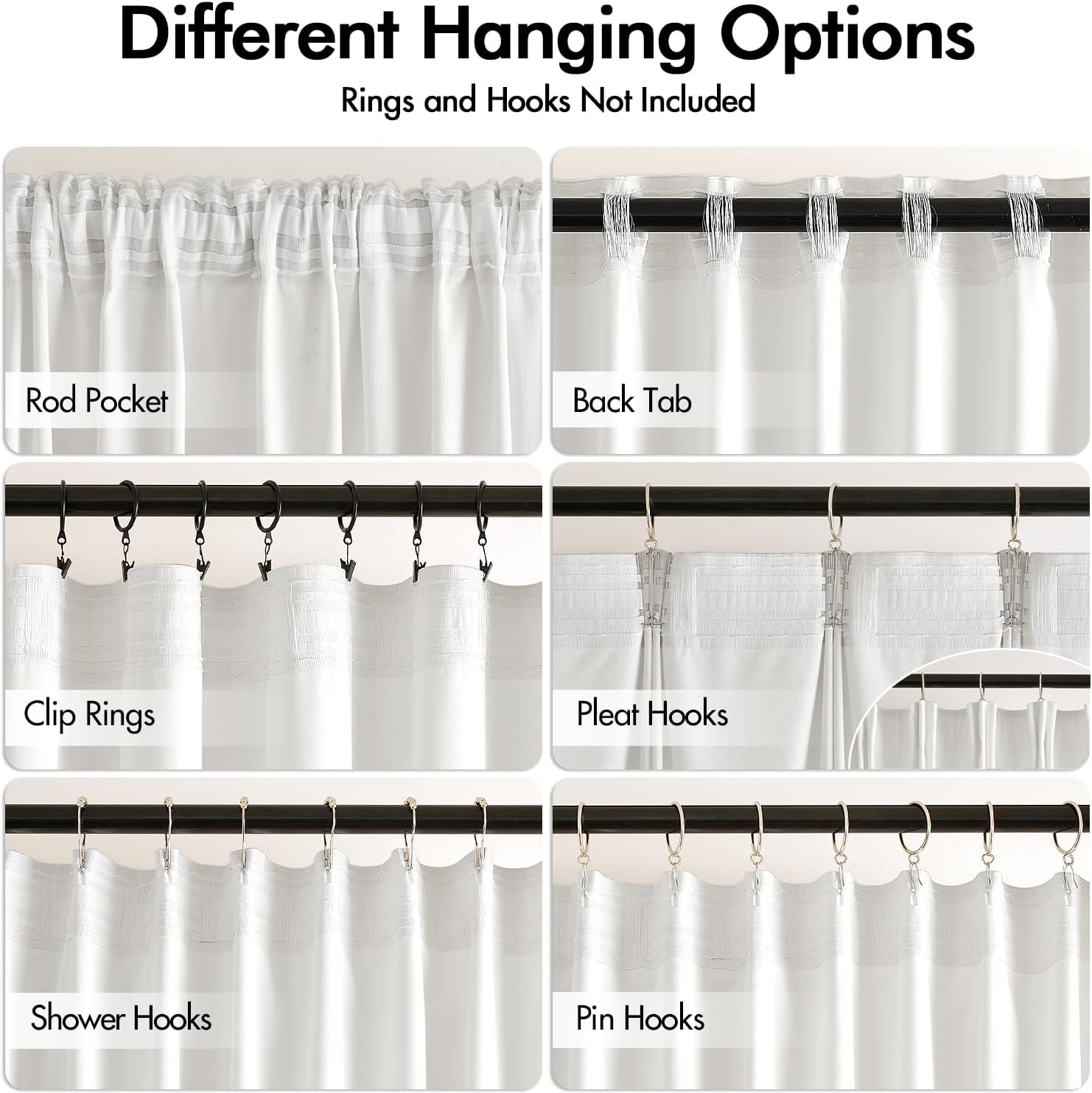 • HANGING OPTIONS: Each curtain panel has 3-in-1 top style design: rod pocket, back tab and pinch pleat. Back loop (2.3 inch) and rod pocket (3.1 inch) fit most standard rod. Curtains also can be hung with clip rings or curtain hooks. 3 ways to meet your various needs.