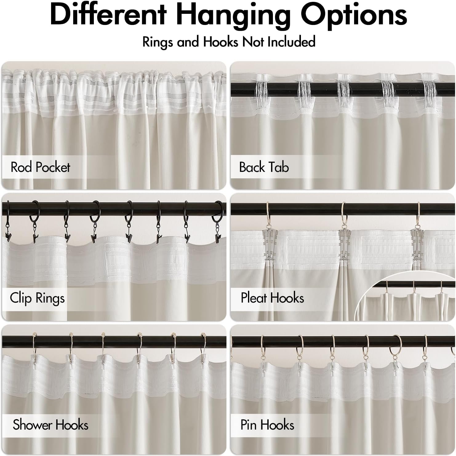 • HANGING OPTIONS: Each curtain panel has 3-in-1 top style design: rod pocket, back tab and pinch pleat. Back loop (2.3 inch) and rod pocket (3.1 inch) fit most standard rod. Curtains also can be hung with clip rings or curtain hooks. 3 ways to meet your various needs.
