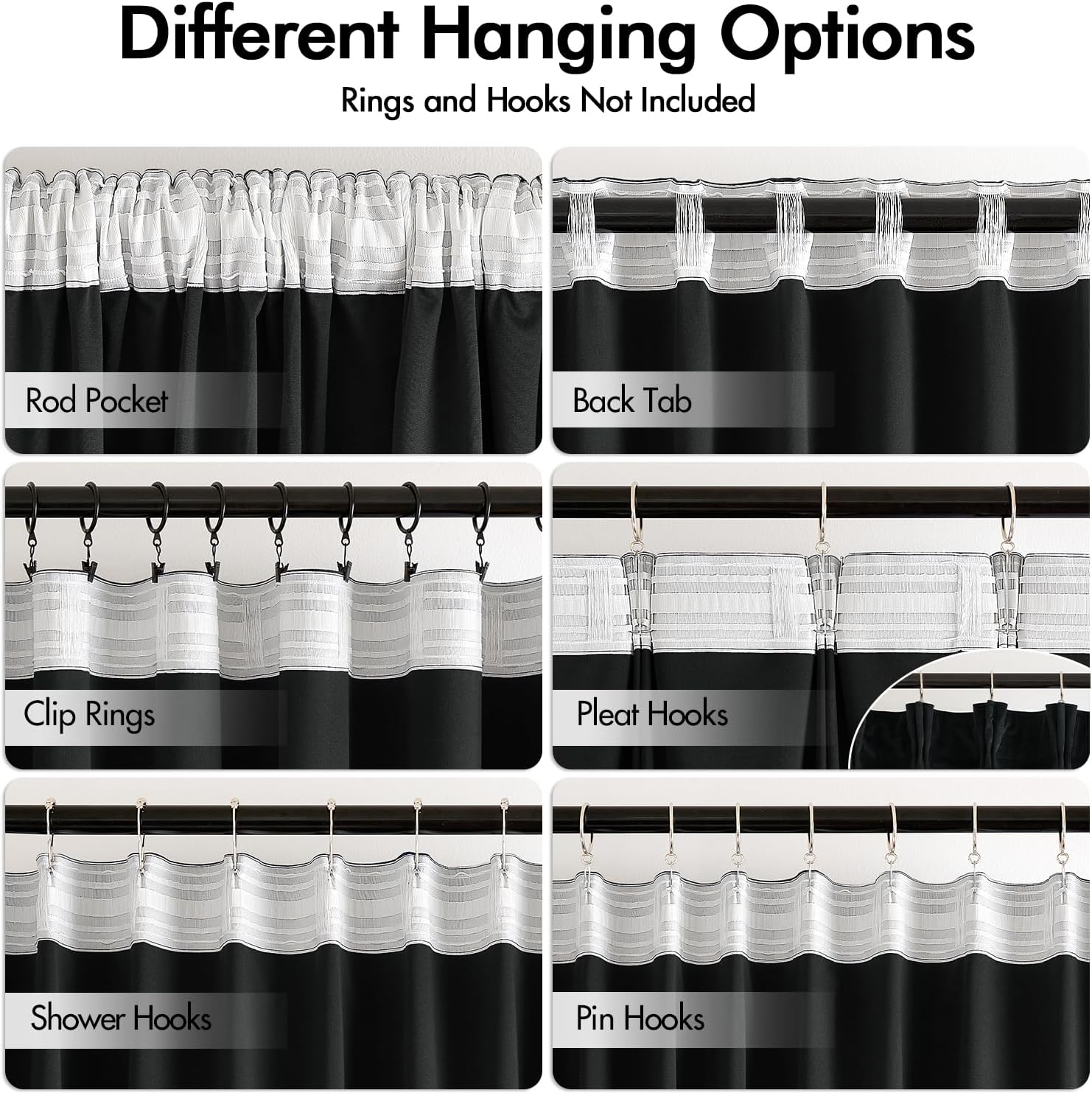 • HANGING OPTIONS: Each curtain panel has 3-in-1 top style design: rod pocket, back tab and pinch pleat. Back loop (2.3 inch) and rod pocket (3.1 inch) fit most standard rod. Curtains also can be hung with clip rings or curtain hooks. 3 ways to meet your various needs.