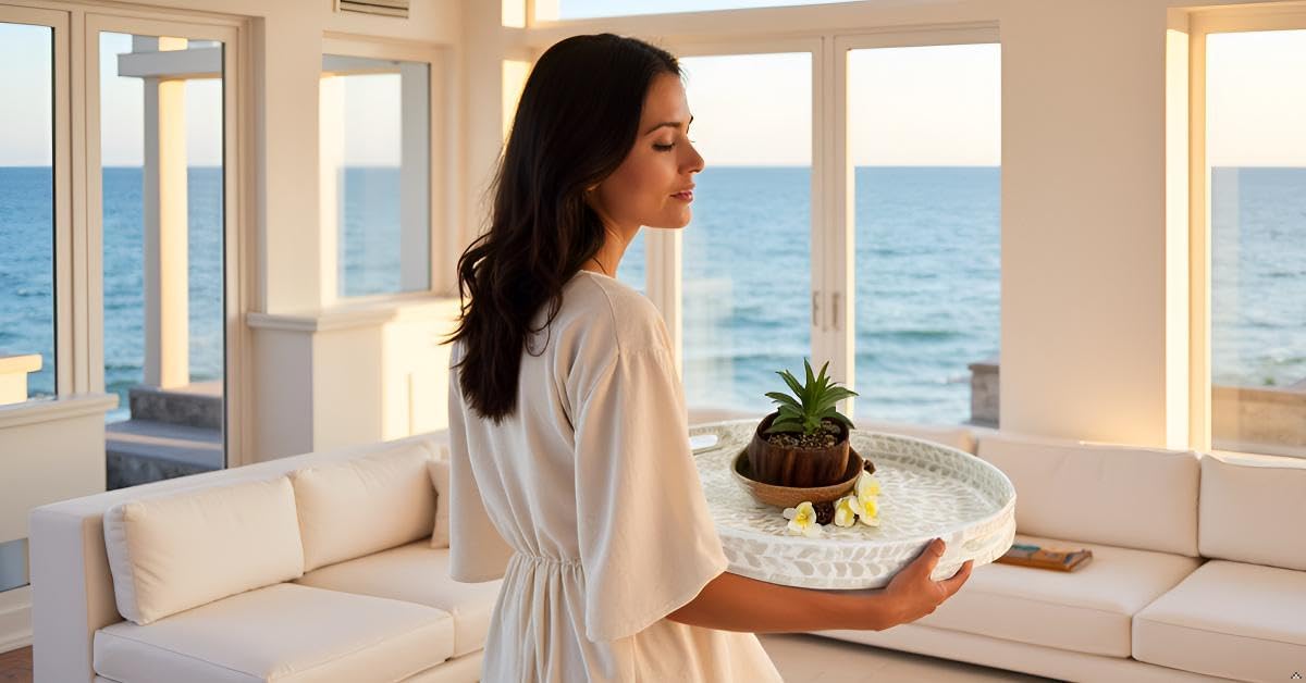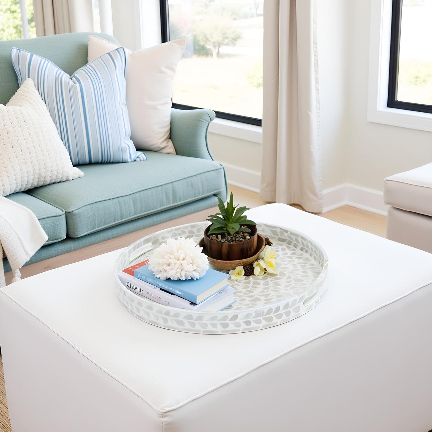 • White STYLISH FLORAL TRAYS with the great workmanship by Vietnamese artisans, flawlessly finished with strong wood core and blue floral pattern well-sorted MOTHER OF PEARL SHELLS inlayed on the surface creates an elegant handmade centerpiece to brighten your decoration, best matches any beach/coastal nauticaNew Home Gifts For Homel theme.