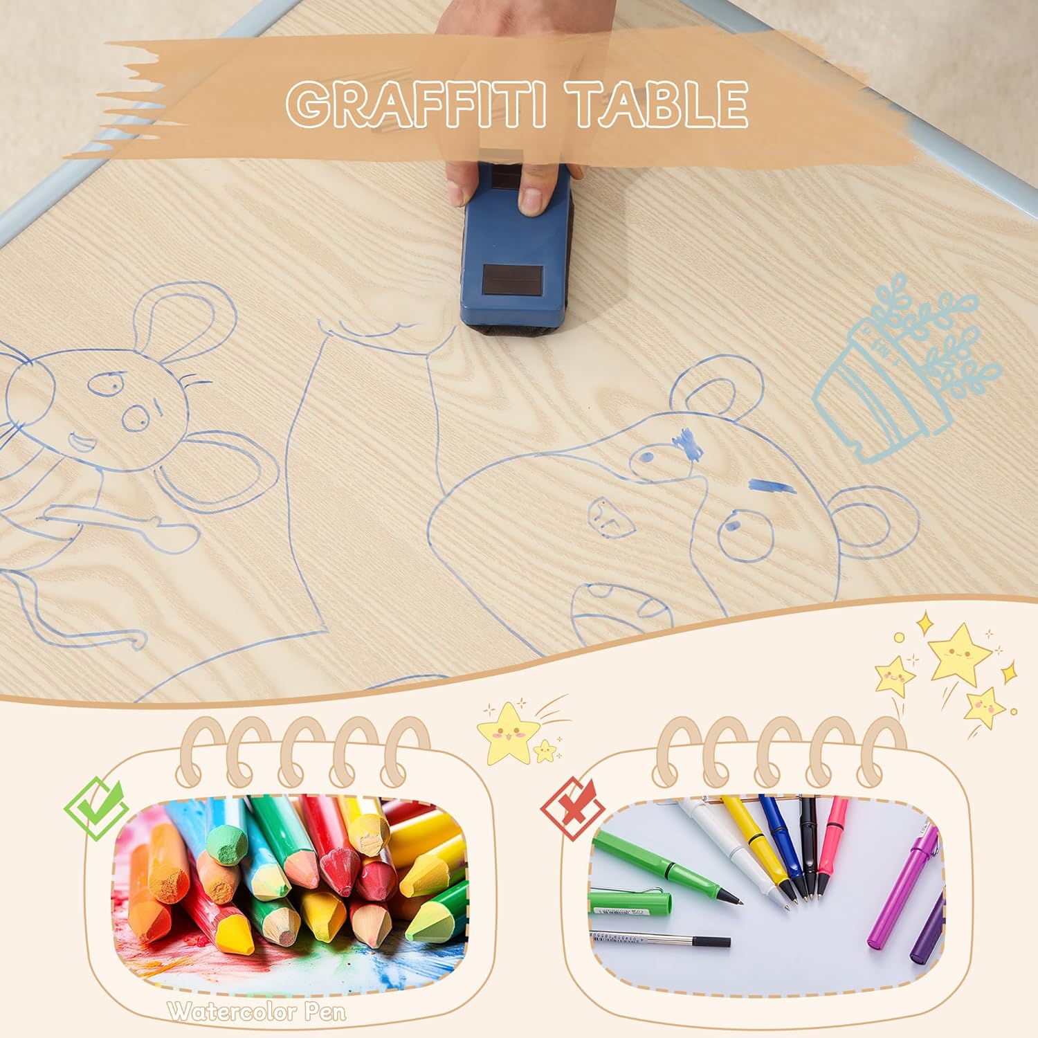 • 【Multifunctional Toddler Table】The dimension of this toddler table is 31.5''L x 23.6''W. Our toddler table provides ample space for various activities. Its tabletop allows kids to draw with oily or water-based paintbrushes, easily wiped clean with a damp cloth. Besides drawing, this table and chair set serves as a platform for studying, reading, eating, playing with toys, and more. Designed with edged borders to prevent objects from sliding off and rounded corners to safeguard children from accidental bumps.