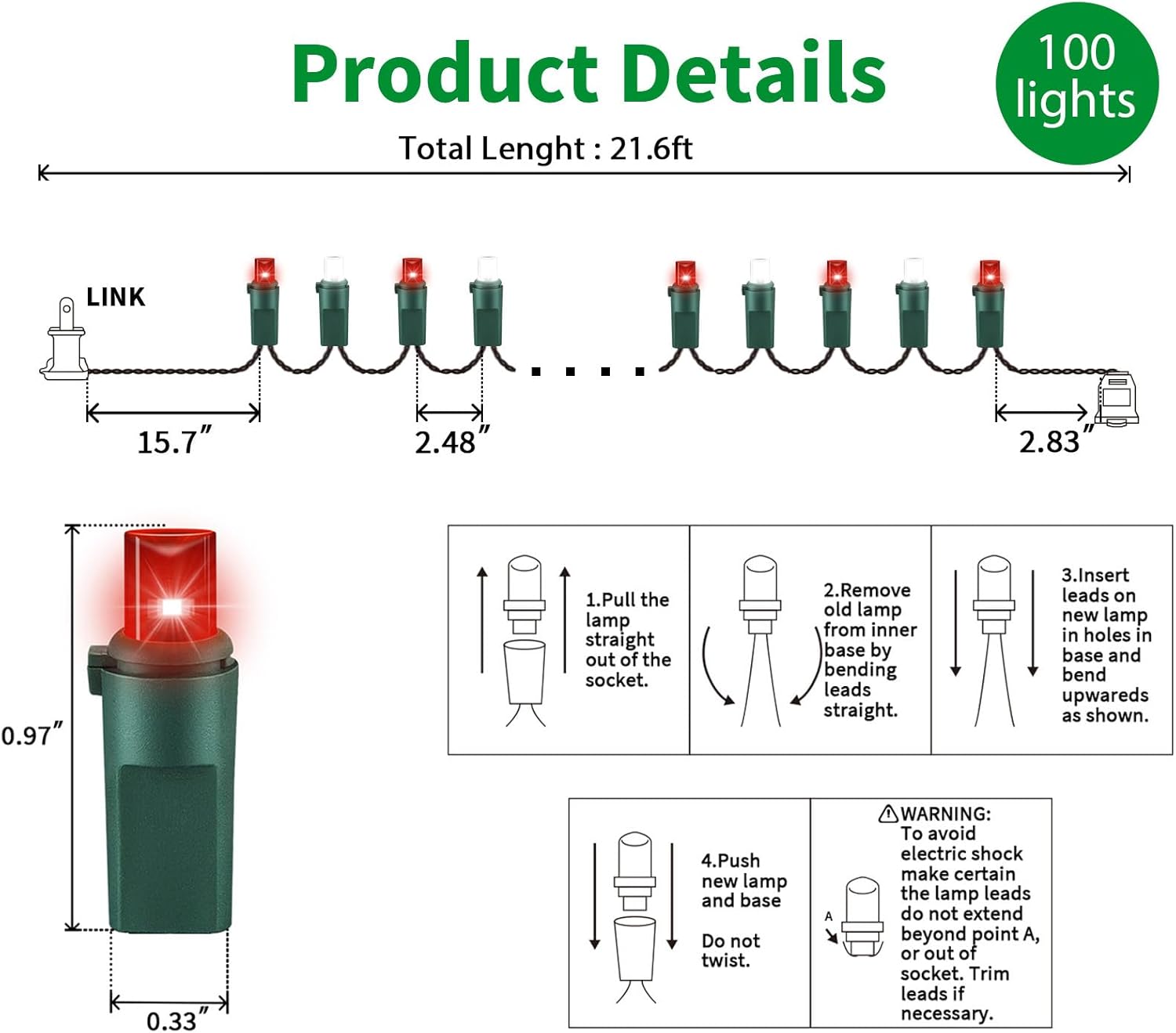 • 5mm LED Christmas Lights: 100 counts Red and White 5mm wide angle stable LED string lights spaced 6.3 inches apart with green wire. 7.1 inch leads have a stackable male plug and 5.9 inch tails have a female plug for easy end to end connection.