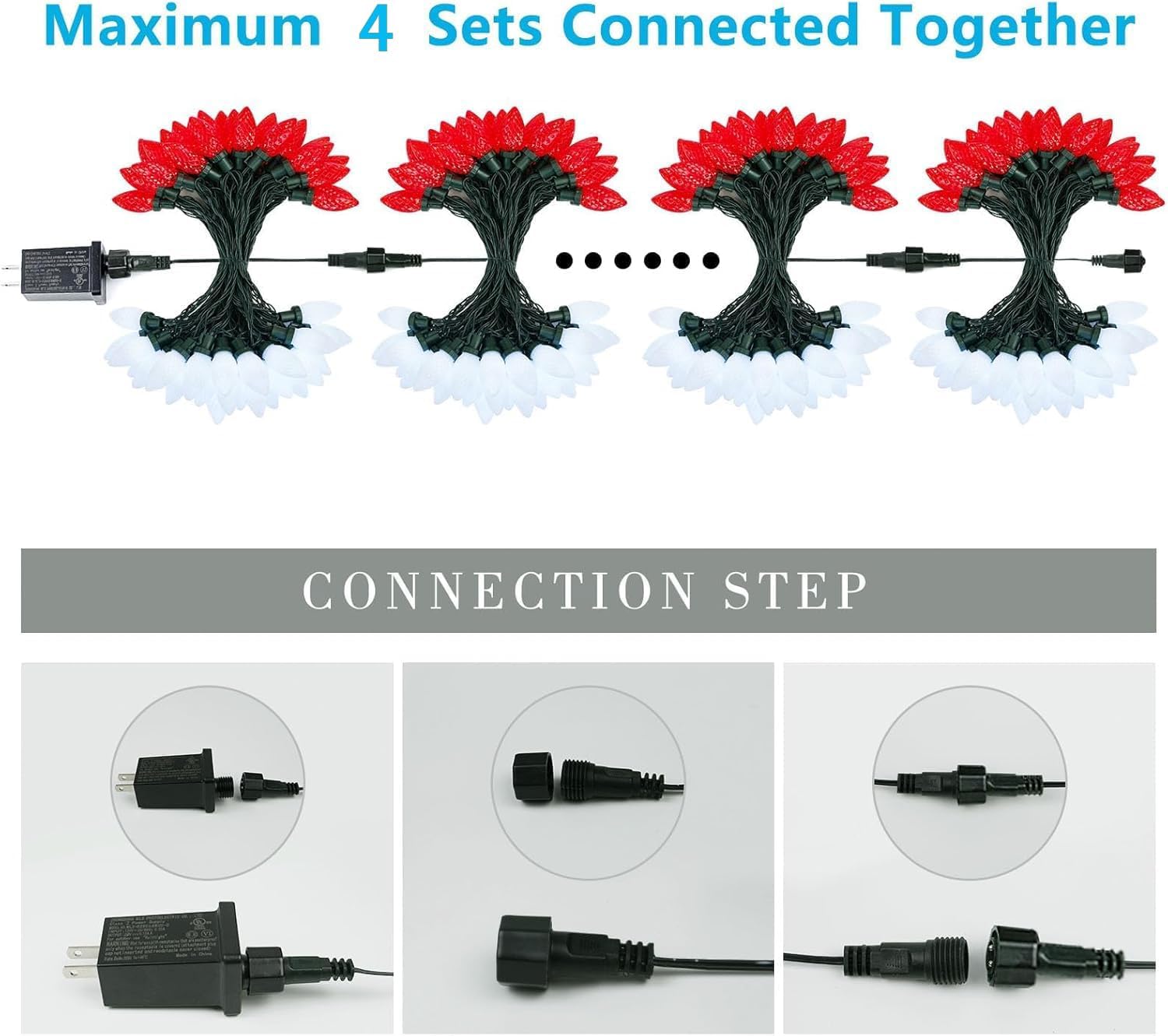 • C9 Led Christmas Lights for Outdoor & Indoor: Total length is 49ft, of which 33ft with lights. Super bright with new upgraded LED chips. These waterproof C9 Christmas string lights have red and white 50 LED bulbs to satisfy your diverse decorative effect.