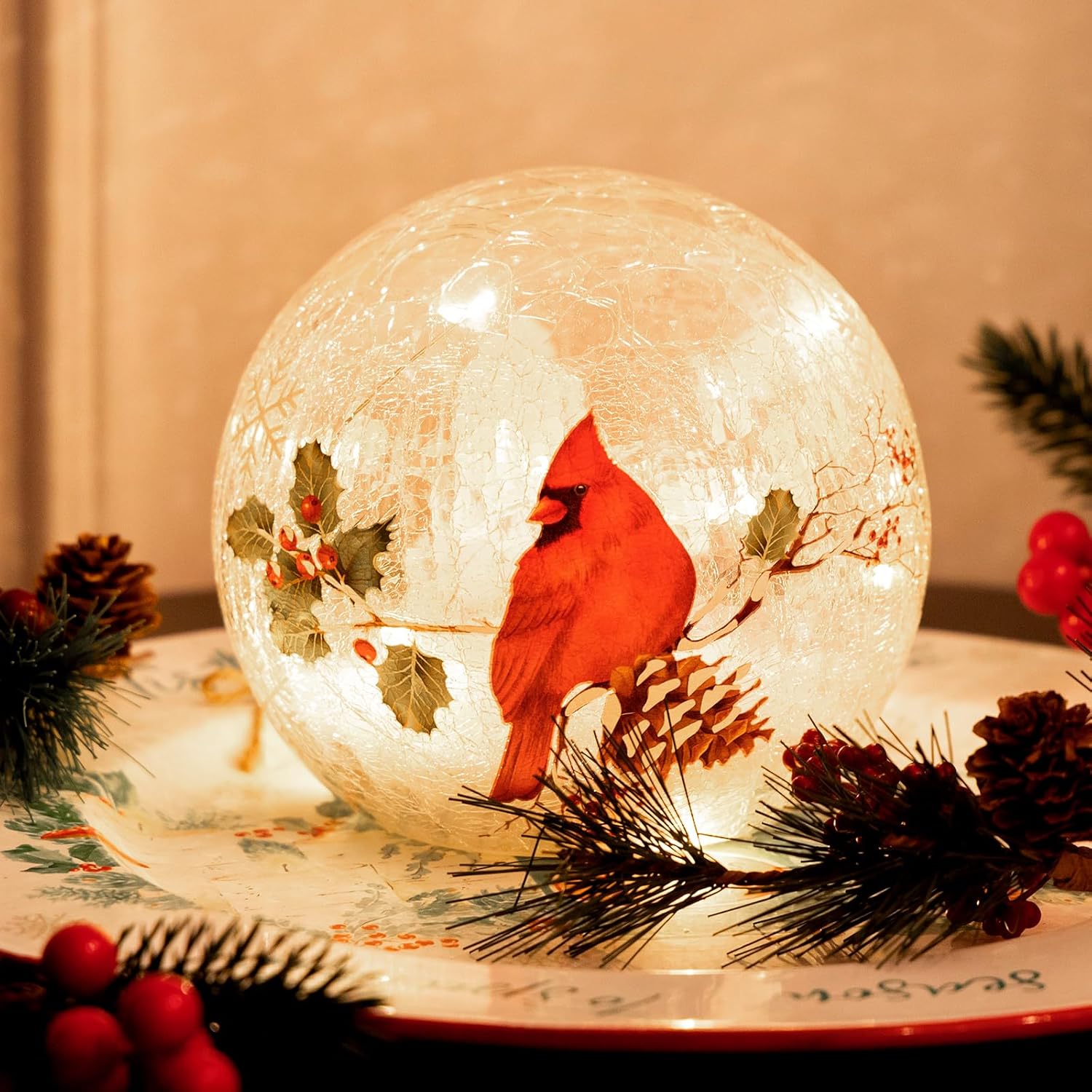 Christmas Decorations Indoor,Glass Globe Cardinal Lamp,Crackle Ball LED Lights Battery Operated,with Timer Snowflake Inside,Red Bird,Night Light for Table Decor (Large)
