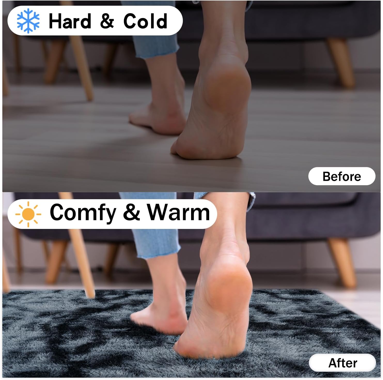 • Rezutan Area Rugs-Soft Fluffy Rug:The Rezutan shag area rug is crafted from durable microfiber, ensuring a plush and incredibly comfortable experience. Its 1.7-inch high pile surface is dense and velvety to the touch, while the 0.3-inch memory foam provides superior cushioning, isolating you from the cold ground and offering soundproofing benefits. Because of the plush fur on the Soft Fluffy rug, you’ll feel like walking on the clouds when walking barefoot on the large bedroom rugs.