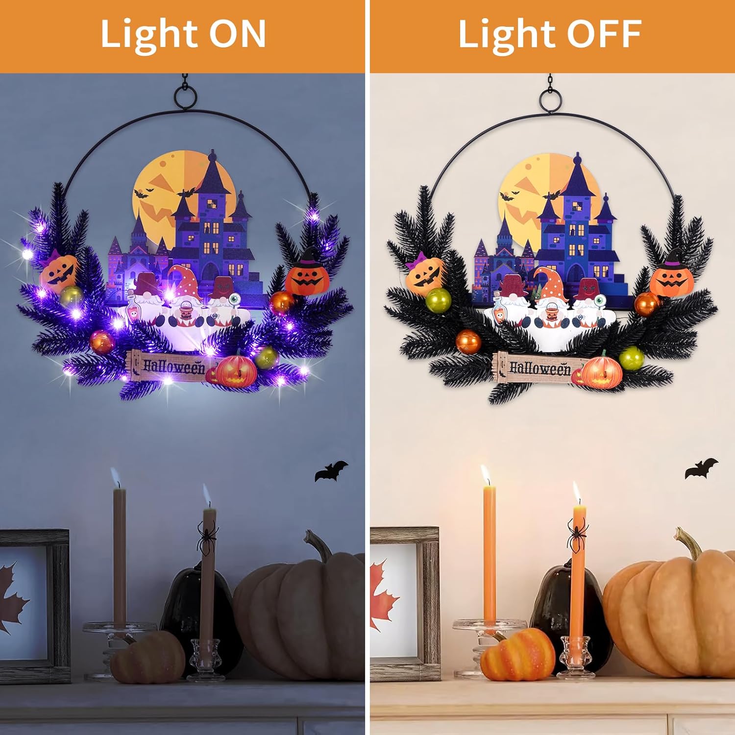 • Perfect Choice: This Halloween lighted wreath decorations that perfectly decorates front doors, walls, fireplaces and Windows to create a joyous and festive atmosphere is a great gift for friends and family who love Halloween, as well as adding a festive atmosphere to the home