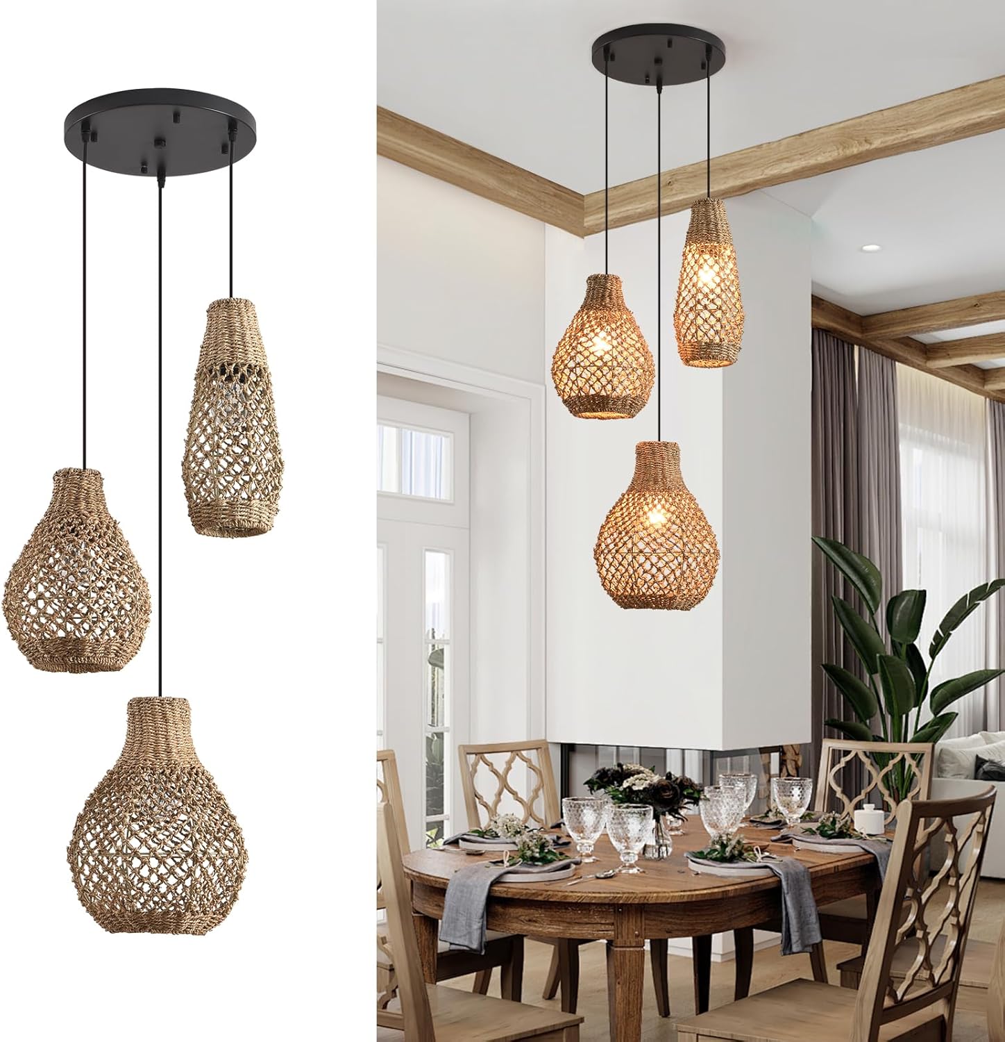 Boho Rattan Pendant Light,3 Light Coastal Woven Wicker Ceiling Hanging Farmhouse Chandelier for Kitchen Island Living Room Dining Room