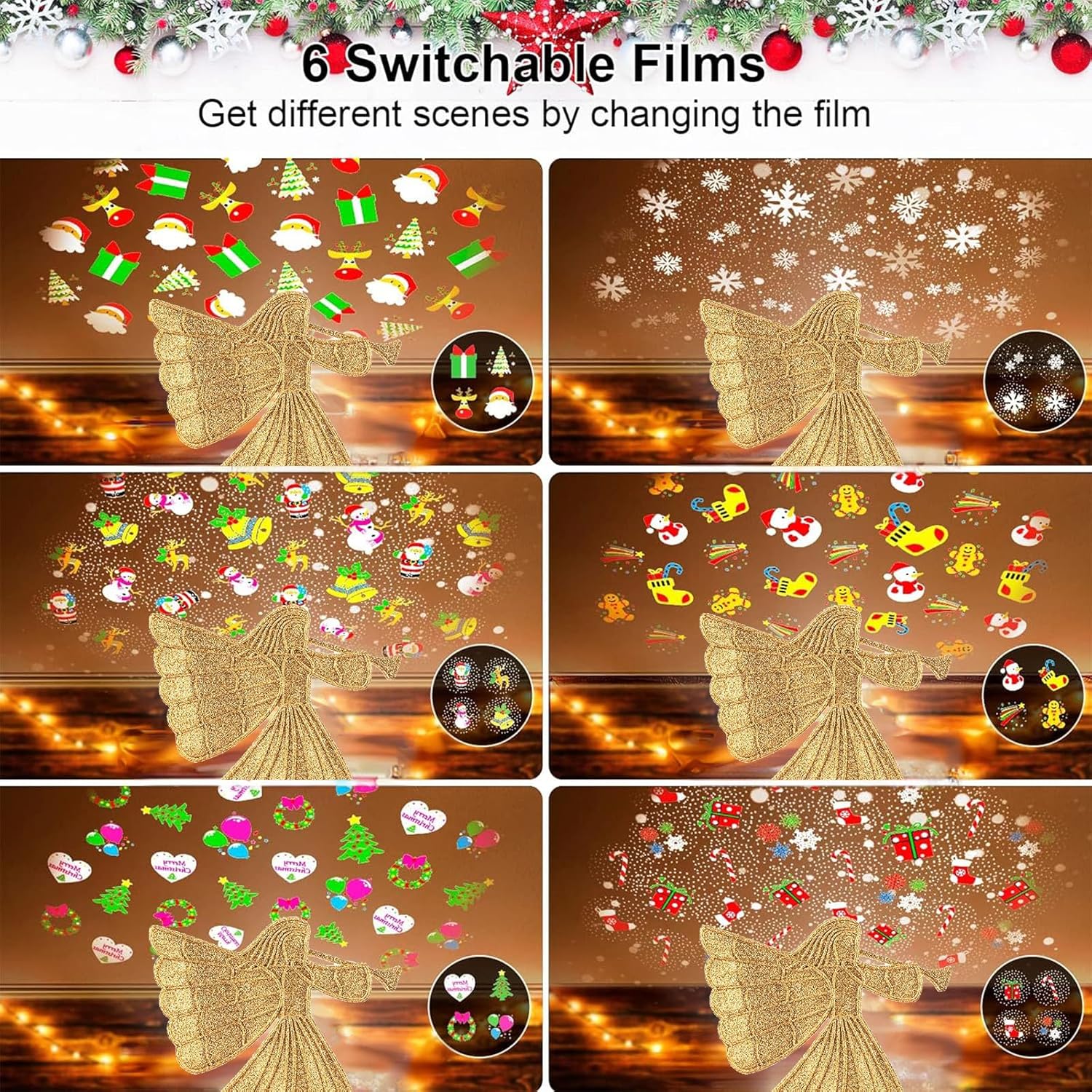 • LED projector: Multifunctional projector angel topper, built-in a 4 LED with auto-moving motor, projecting an animated 6 different photos effect of dynamic dancing 6 different photos spots patterns, a vivid snowy picture indeed. The upward shooting area reaches 21-53 sq.Ft., sufficient for a common room or living room decorating