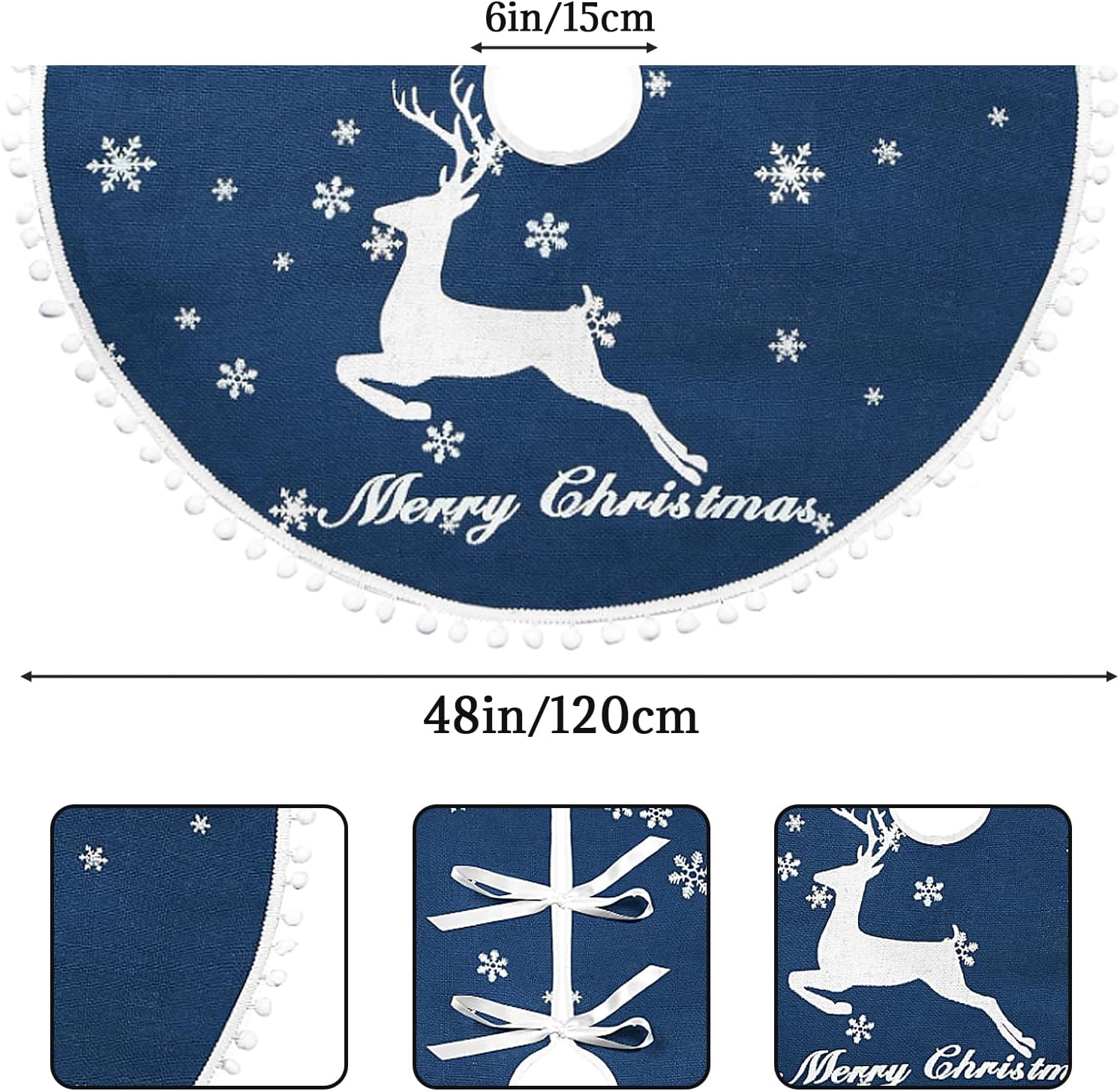 48 Inch Christmas Tree Skirt, Burlap Blue Christmas Rustic Tree Skirt with Elk Deer and White Snowflake Printed for Holiday Party Xmas Tree Decoration