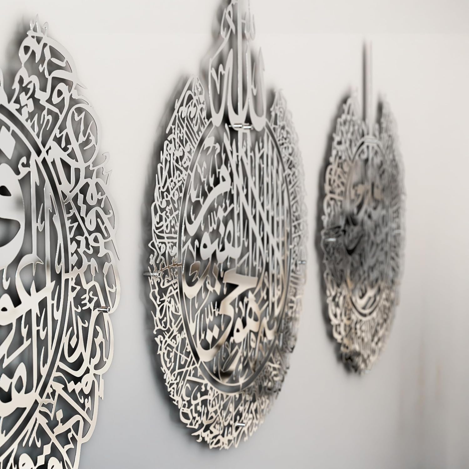iwa concept Set of 3 Ayatul Kursi, Surah Al Falaq, Surah An Nas Islamic Metal Wall Art, Quran Wall Art, Arabic Calligraphy, Pray Room Decorations (M, Shiny Silver)