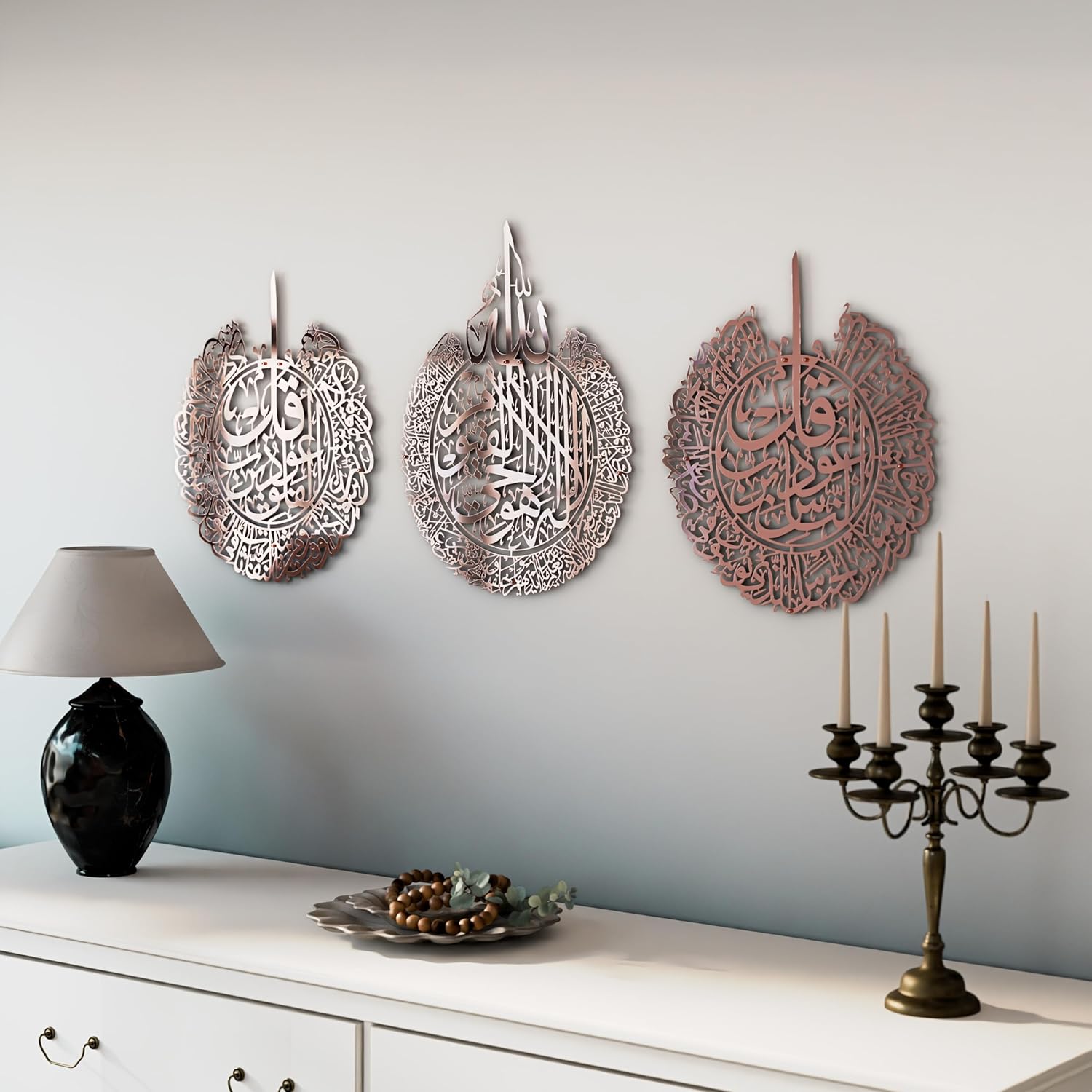 iwa concept Set of 3 Ayatul Kursi, Surah Al Falaq, Surah An Nas Islamic Metal Wall Art, Quran Wall Art, Arabic Calligraphy, Pray Room Decorations (M, Shiny Copper)