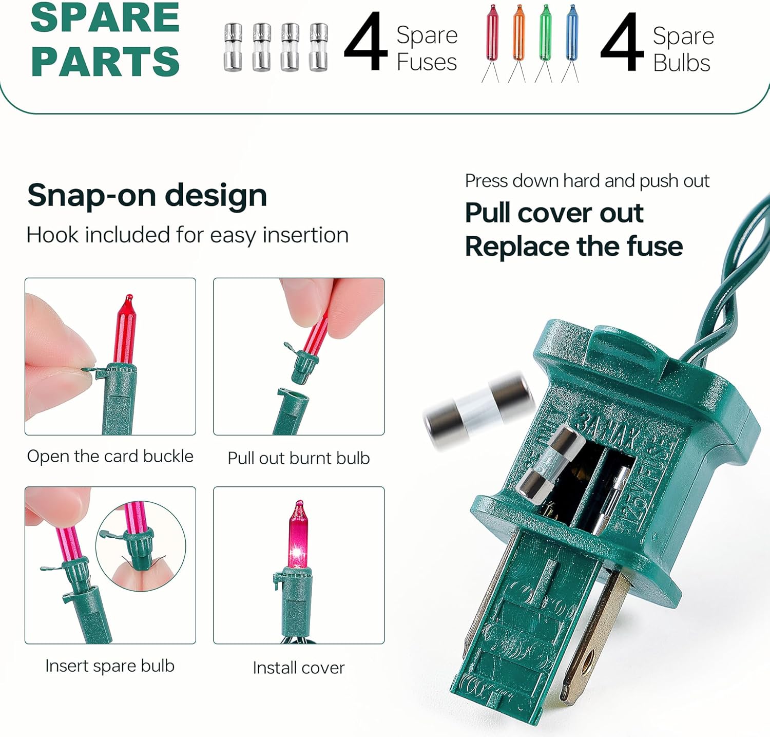 • 🎈Unique Design Christmas Lights: The bulb is designed a snap-on design, preventing their dislodgment and prolonging their working lifespan. The stackable plugs facilitate effortless installation. Just plug in and unplug for power activation and deactivation. This is a highly distinctive design. String lights Comes with 4 Extra fuse& 4 Extra Bulbs for you to replace. You can replace damaged bulbs individually with the spare bulb or fuse provided by us.