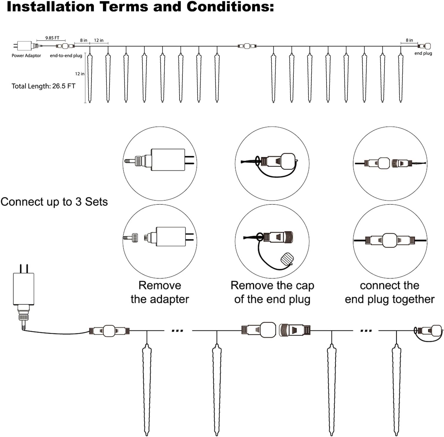 • Connectable Length: These icicle falling string lights have 16 tubes, each icicle tube is 12 inches long, each has 24 SMD LED beads, and the brightness is consistent from any angle. There is a connector plug on the front end, can be end-to-end extended to a max of 3 sets, and be powered by only one plug conveniently