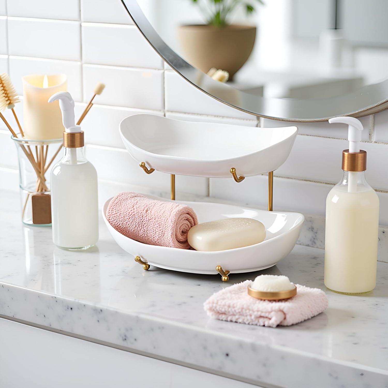 HBlife Fruit Bowl for Kitchen Counter - 2 Tier Fruit Basket with Metal Stand, Ceramic Fruit Holder for Fruit Vegetable Storage, Serving Platters Serving Trays for Party