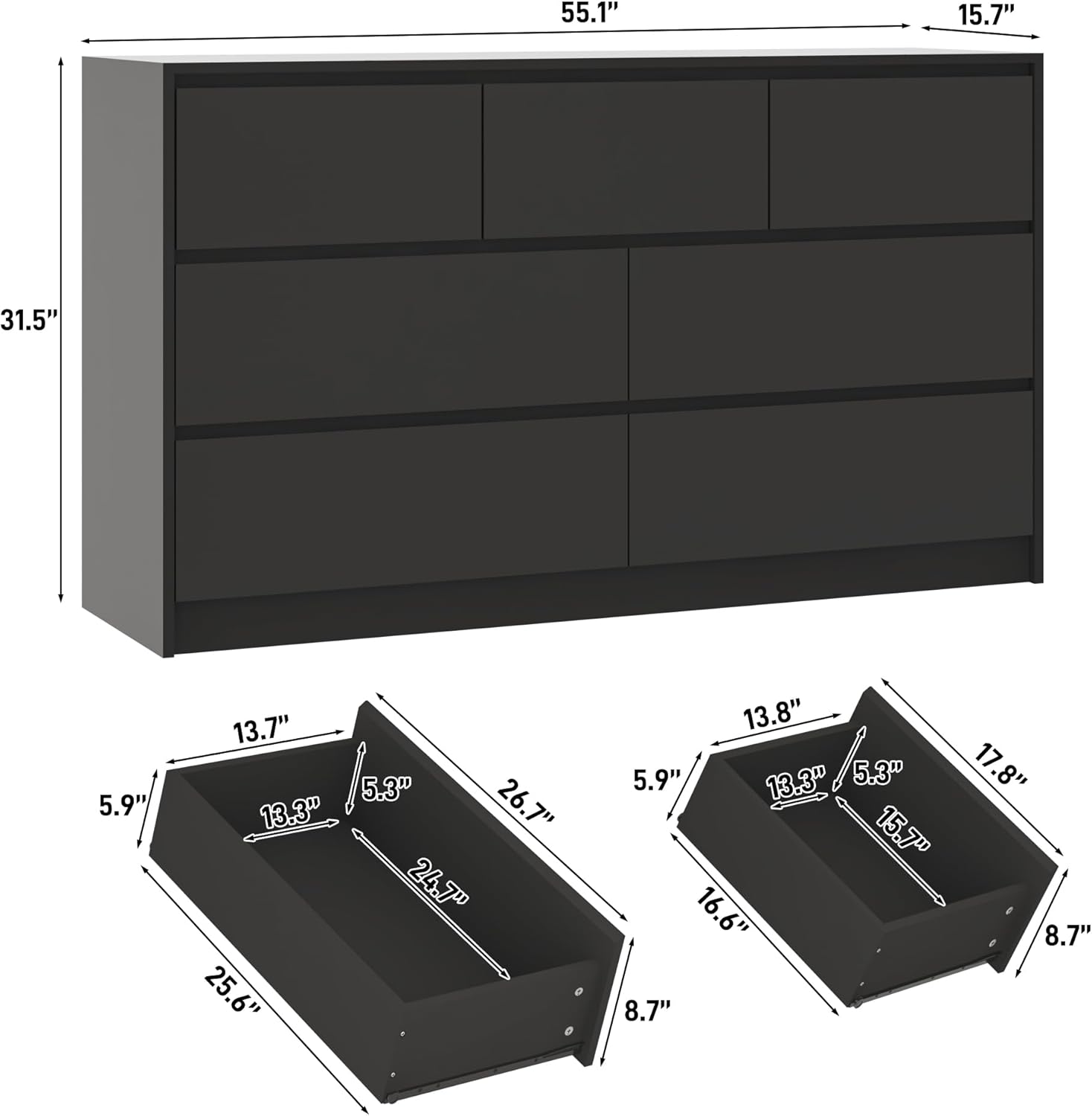 • 【Spacious interior】Overall size:55.1"D x 15.7"W x 31.5"H. Drawers dimensions: 26.8"D x 14" W x 8.7"H and 17.8"D x 14" W x 8.7"H. With 4 large drawers and 3 medium drawers with a depth of 5.9 inches, it is easy to organize your things and keep the room clean and tidy. The roomy top for placing your favorite picture frames, flowers and cute decorations