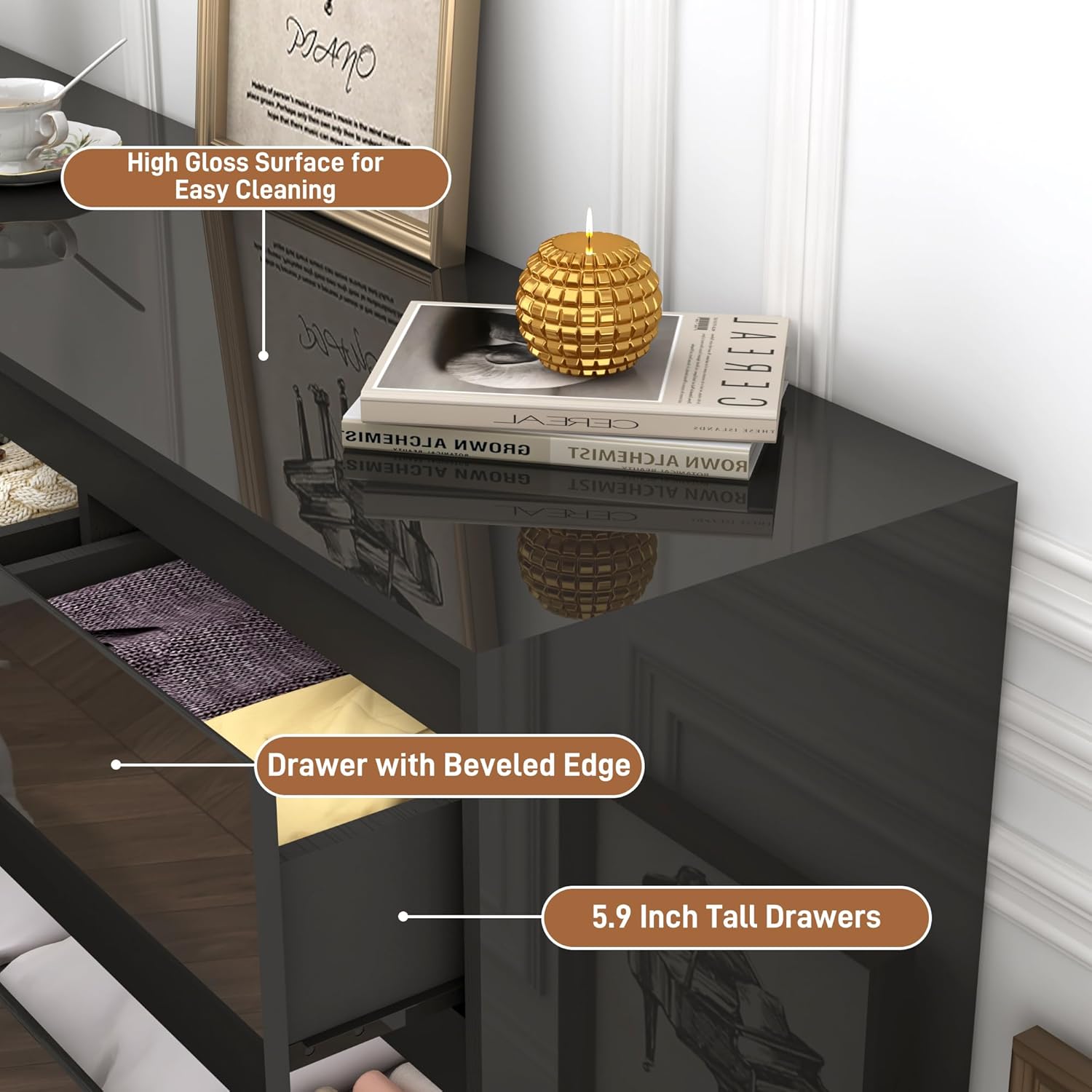 • 【Thick and sturdy】This black modern high gloss dresser is mainly composed of medium-density fiberboard material, which is stable. The retracted bottom base is waterproof and scratch-resistant, metal drawer slides for long-term use. Easy maintenance with just a damp cloth