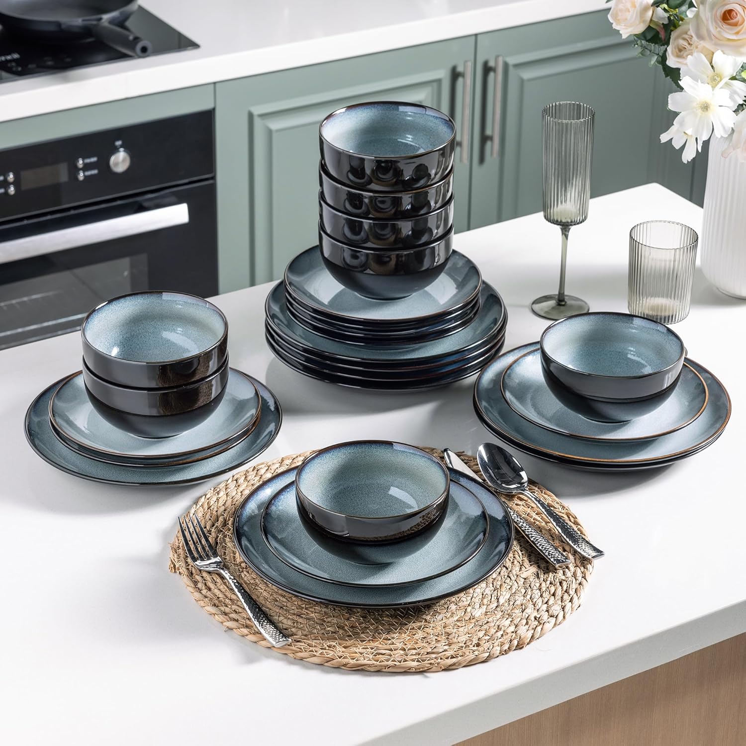 • 【 ELEGANT AND STYLISH DESIGN】This dinnerware set, with its vibrant colors and unique surface treatment, leads the dining trend. With a lively color palette and captivating surface treatment, it creates a warm and enchanting atmosphere. The eye-catching reactive glazes and rich, vivid hues not only soothe the senses but also enhance your dining experience. Another distinctive feature of our product is its ability to be placed in the oven, providing you with more cooking possibilities.