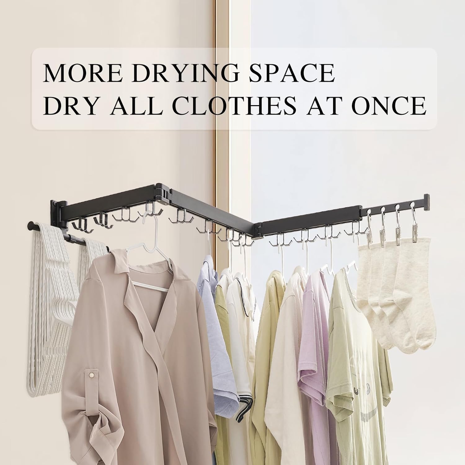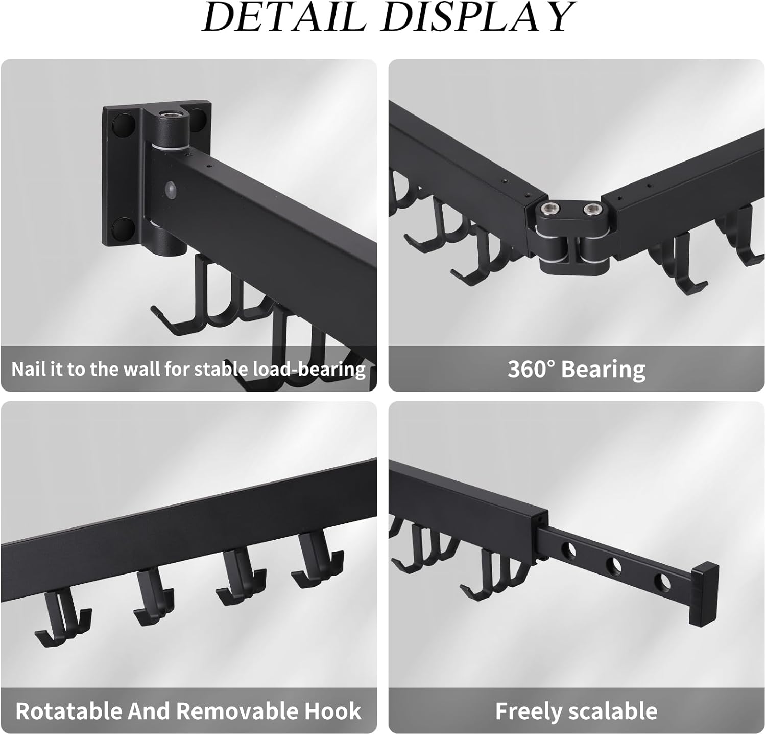 • More functionality: This drying rack clothing wall mount is different from other foldable wall mounted drying racks for laundry in that the upgraded hooks have a Bidirectional J-shape and loop combination, the upgraded telescopic pole has 6 windproof clips, and add a storage hanger pole