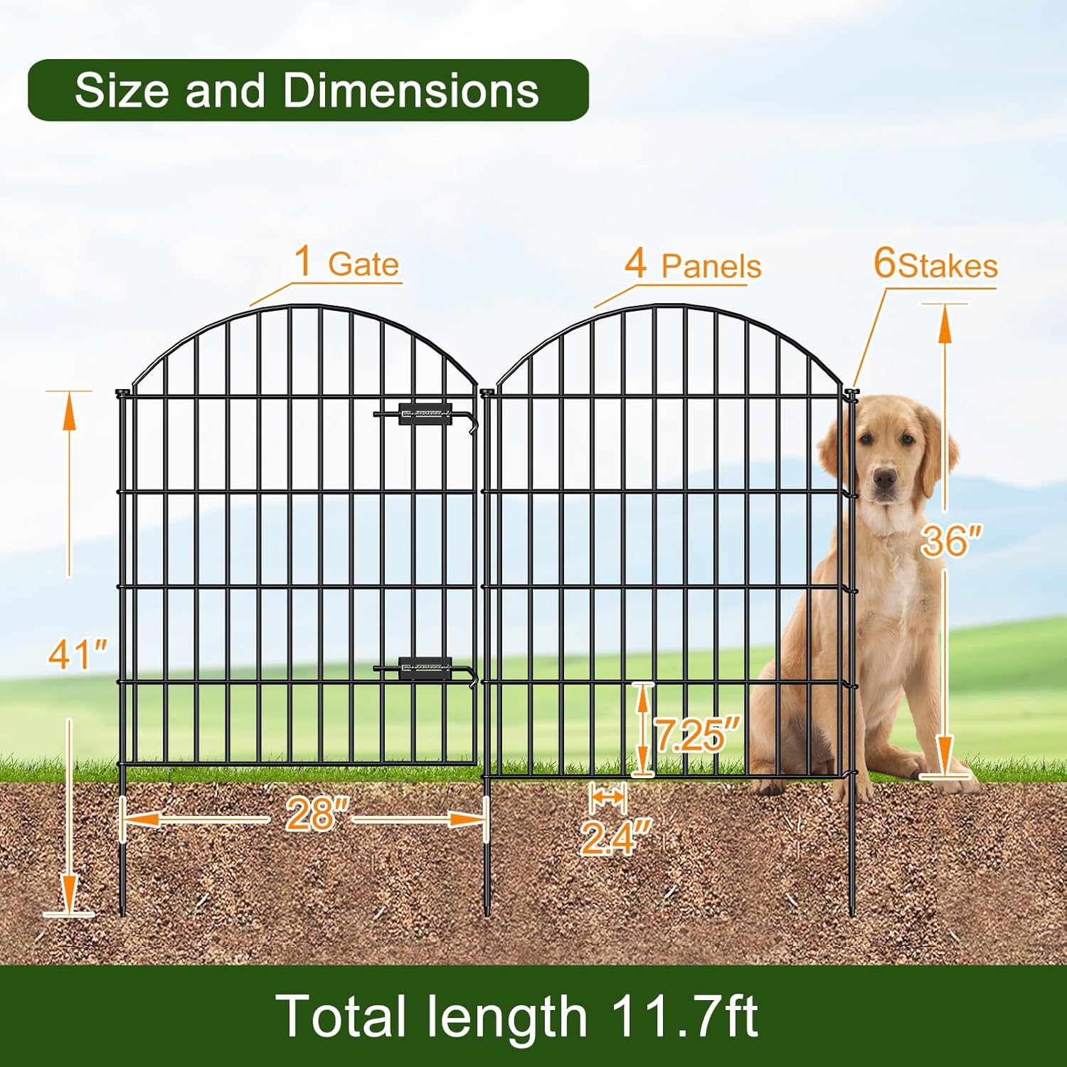 • WHAT'S INCLUDED: 1 Gate + 4 Fence Panels + 6 Stakes in a bundle. Gate panel sized 35” (H) x 28” (W), each Fence Panel sized 36"Hx28"W, each stake height 41 inch, the linear length 11.7 feet, Black color.