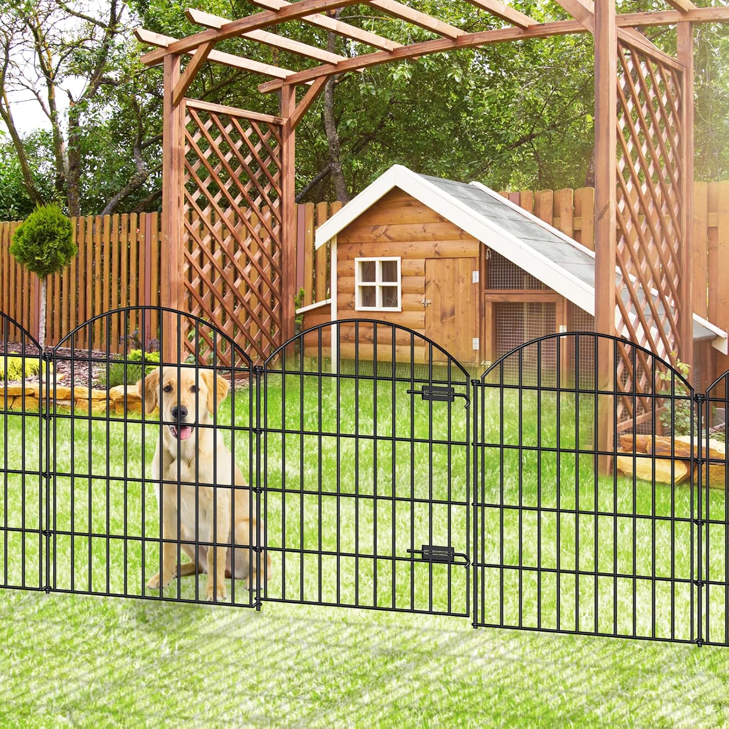• STURDY AND STABLE: This garden gate and fences is welded by Gauge 9 thickness iron wires, the stakes are 10mm in diameter, and can be extended pretty far into the ground which is fairly steady, it works well as a fence with gate for big or medium size dogs.