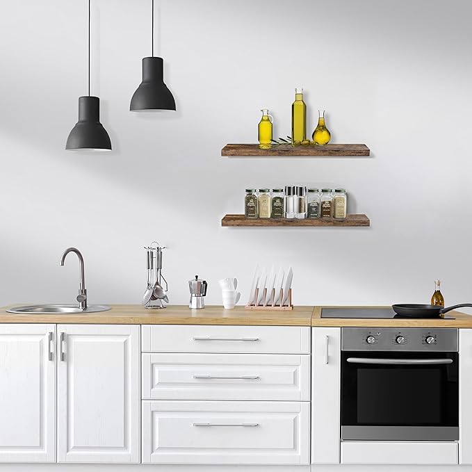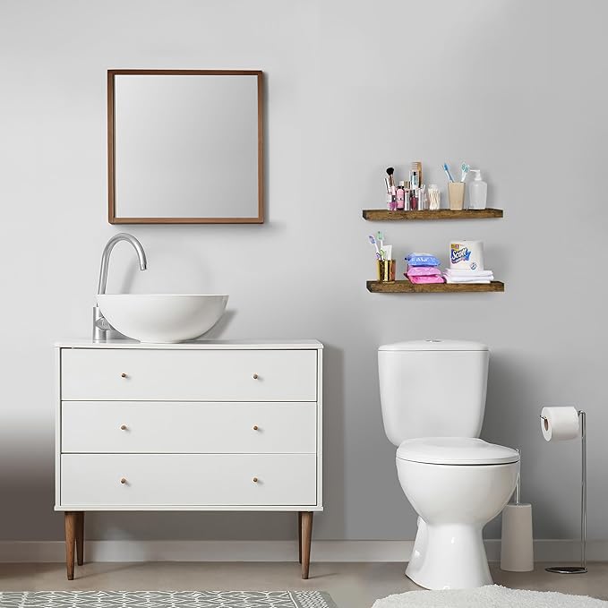 • Versatile & Functional Floating Wall Shelves: Install these floating shelves in the bedroom or bathroom to hold beauty/hair products - Place your wall shelf under a mirror in the entryway or exhibit family photos gallery style in a long hallway - Use as bathroom shelf, book shelf for wall, wall decor for bedroom, over the toilet shelf, kitchen floating shelves, floating nightstand, kitchen decor, living room wall decor, display shelf, and more