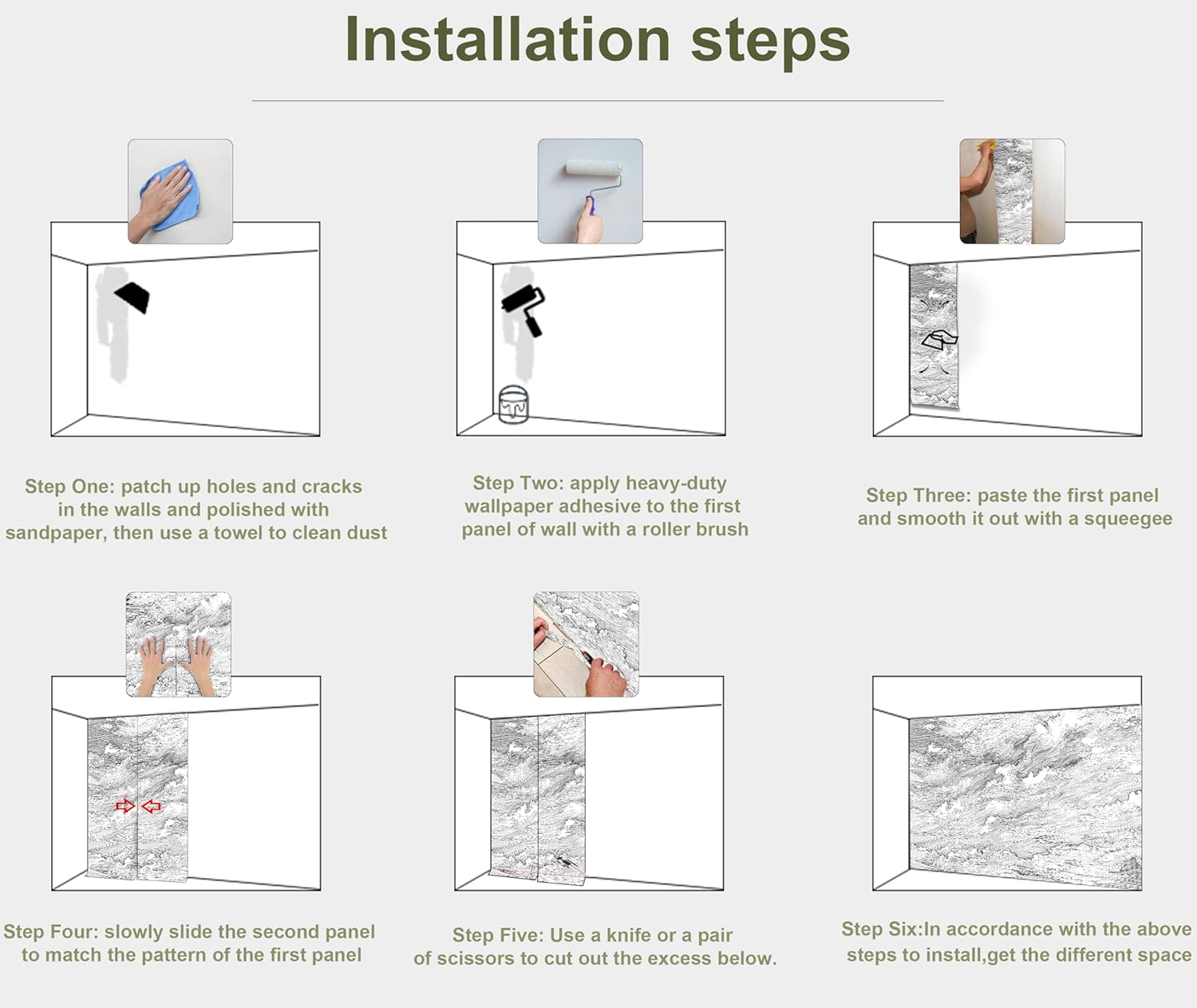 • INSTALLATION - 1.Fill in all cracks or holes and clean dust dirt and grease on the wall surface. 2. Apply the heavy duty wallpaper paste on the wall not mural. 3. Use a spirit level to mark first strip location. 4. match the pattern by sliding into place. 5.use a scraper to smooth out bubbles press. 6. Let dry for a few minutes and that's it! Please Note: Not self-adhesive. We recommend to use a standardized fleece wallpaper paste.
