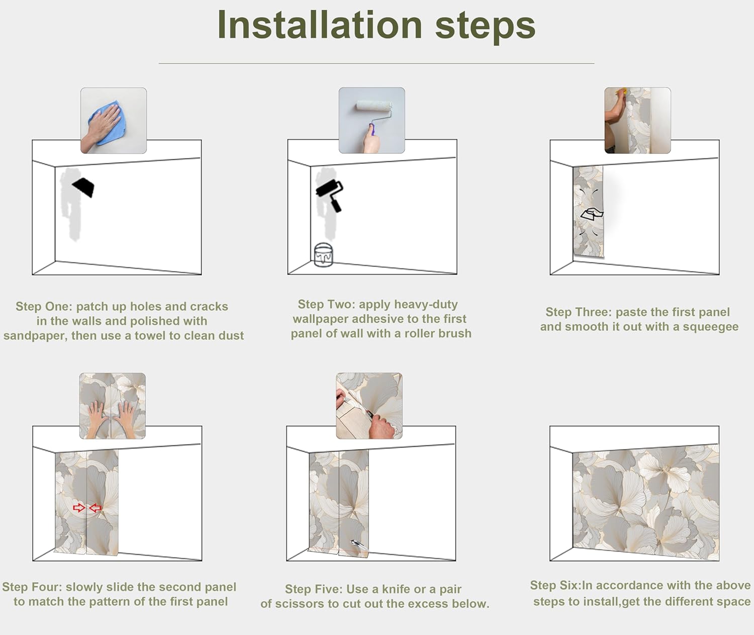 • INSTALLATION - 1.Fill in all cracks or holes and clean dust dirt and grease on the wall surface. 2. Apply the heavy duty wallpaper paste on the wall not mural. 3. Use a spirit level to mark first strip location. 4. match the pattern by sliding into place. 5.use a scraper to smooth out bubbles press. 6. Let dry for a few minutes and that's it! Please Note: Not self-adhesive. We recommend to use a standardized fleece wallpaper paste.