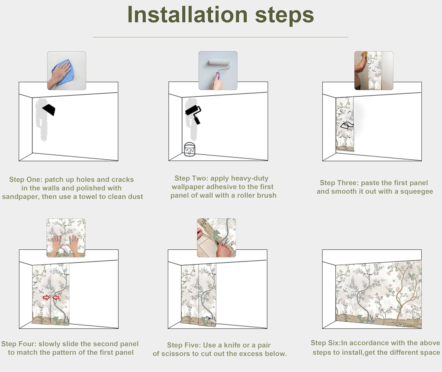 • INSTALLATION - 1.Fill in all cracks or holes and clean dust dirt and grease on the wall surface. 2. Apply the heavy duty wallpaper paste on the wall not mural. 3. Use a spirit level to mark first strip location. 4. match the pattern by sliding into place. 5.use a scraper to smooth out bubbles press. 6. Let dry for a few minutes and that's it! Please Note: Not self-adhesive. We recommend to use a standardized fleece wallpaper paste.