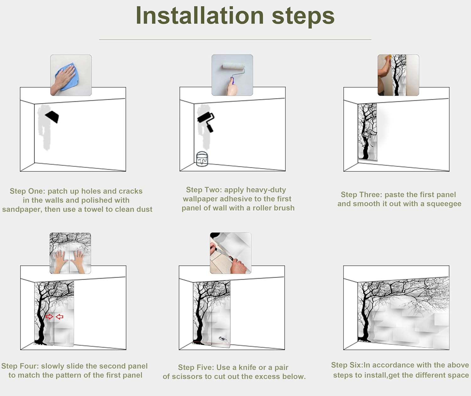 • INSTALLATION - 1.Fill in all cracks or holes and clean dust dirt and grease on the wall surface. 2. Apply the heavy duty wallpaper paste on the wall not mural. 3. Use a spirit level to mark first strip location. 4. match the pattern by sliding into place. 5.use a scraper to smooth out bubbles press. 6. Let dry for a few minutes and that's it! Please Note: Not self-adhesive. We recommend to use a standardized fleece wallpaper paste.