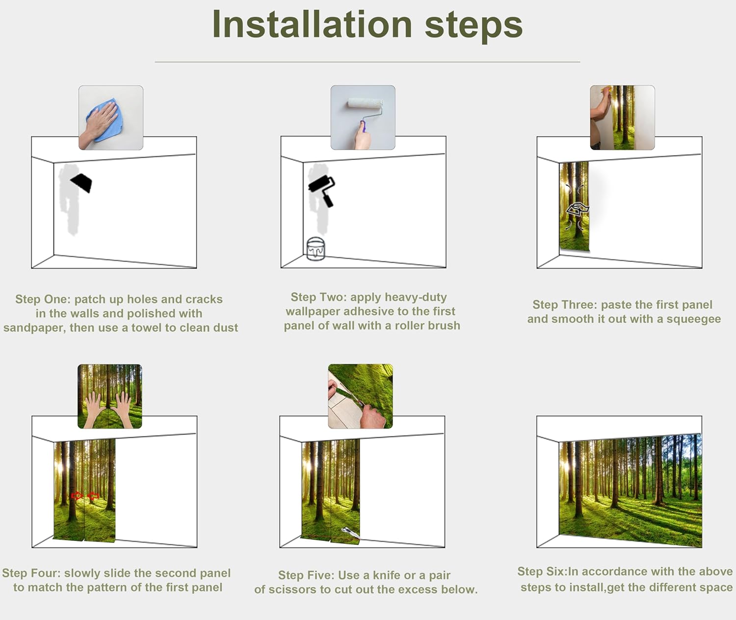 • INSTALLATION - 1.Fill in all cracks or holes and clean dust dirt and grease on the wall surface. 2. Apply the heavy duty wallpaper paste on the wall not mural. 3. Use a spirit level to mark first strip location. 4. match the pattern by sliding into place. 5.use a scraper to smooth out bubbles press. 6. Let dry for a few minutes and that's it! Please Note: Not self-adhesive. We recommend to use a standardized fleece wallpaper paste.