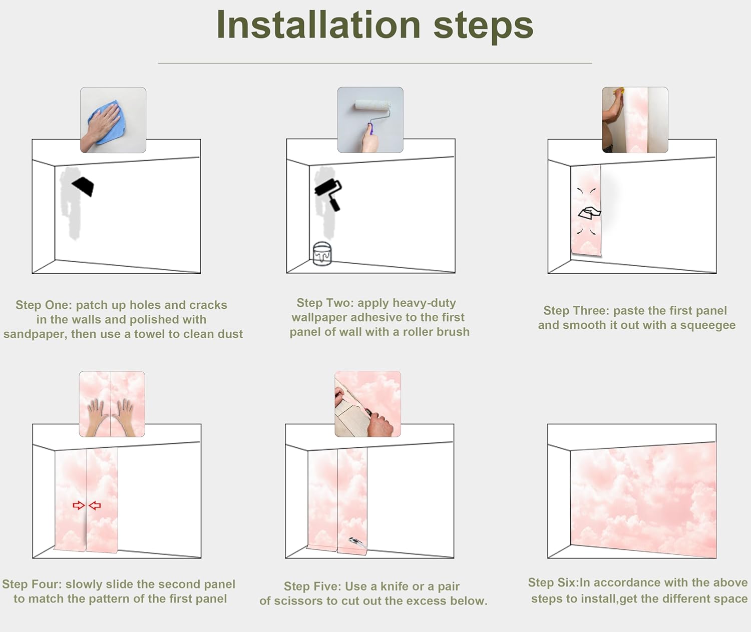 • INSTALLATION - 1.Fill in all cracks or holes and clean dust dirt and grease on the wall surface. 2. Apply the heavy duty wallpaper paste on the wall not mural. 3. Use a spirit level to mark first strip location. 4. match the pattern by sliding into place. 5.use a scraper to smooth out bubbles press. 6. Let dry for a few minutes and that's it! Please Note: Not self-adhesive. We recommend to use a standardized fleece wallpaper paste.
