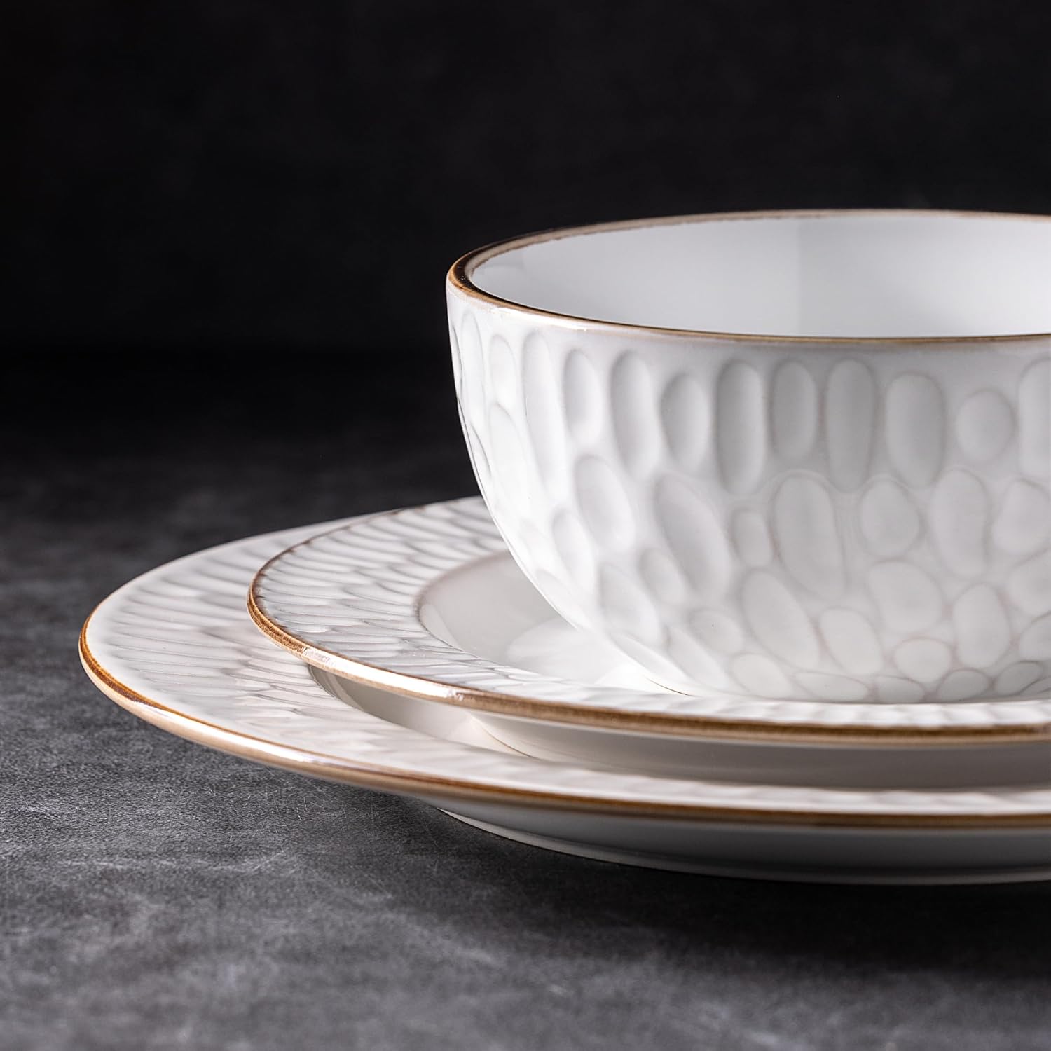 • UNIQUE MODERN DESIGN: Our 24-piece ceramic dinnerware set features a modern and elegant embossment design, allowing your dinner plate and bowl to be the star of the table. The glaze is pure snow-white with light embossment, and darkened rims, which look ultra classy and beautiful. This white dinnerware set is durable enough for everyday use for the family, yet sophisticated enough for that important dinner party or special event. Perfect for wedding and housewarming gifts