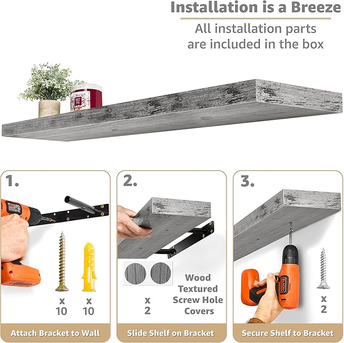 • Easy to Install: Minor assembly required, detailed instructions included. Hanging shelves are made of beautiful, engineered faux wood (not solid wood) with a smooth matte finish. Enhanced steel brackets attach firmly to the wall. Sturdy enough to hold up to 22 lbs. Mounting hardware INCLUDED. Color of bathroom shelf may be slightly different from the product photos due to lighting and screen settings