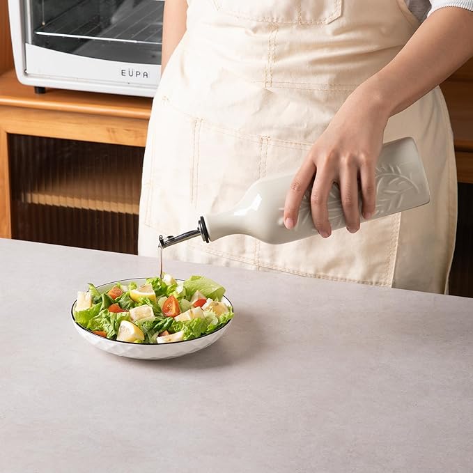 • Durable and Precise Pouring Control - The olive oil bottle fired at high temperatures, to form a smooth glazed surface, strength and durability. The carefully designed spout that allows for easy pouring without any messy drips or spills.