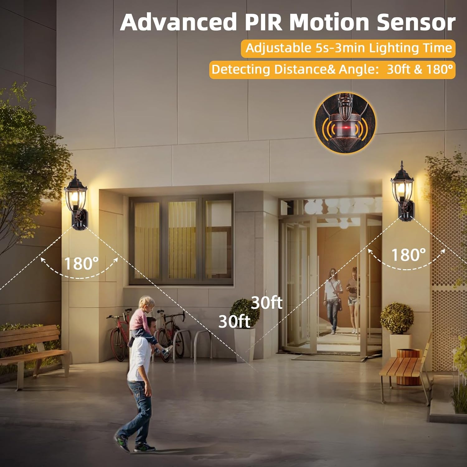 • Wide Detected Range & Compatible With E26 Bulbs: Our motion sensor wall lanterns can be easily triggered by moving people, cars or animals. The detection distance of sensor is from 0 to 30 feet. Bulbs are not included in the package