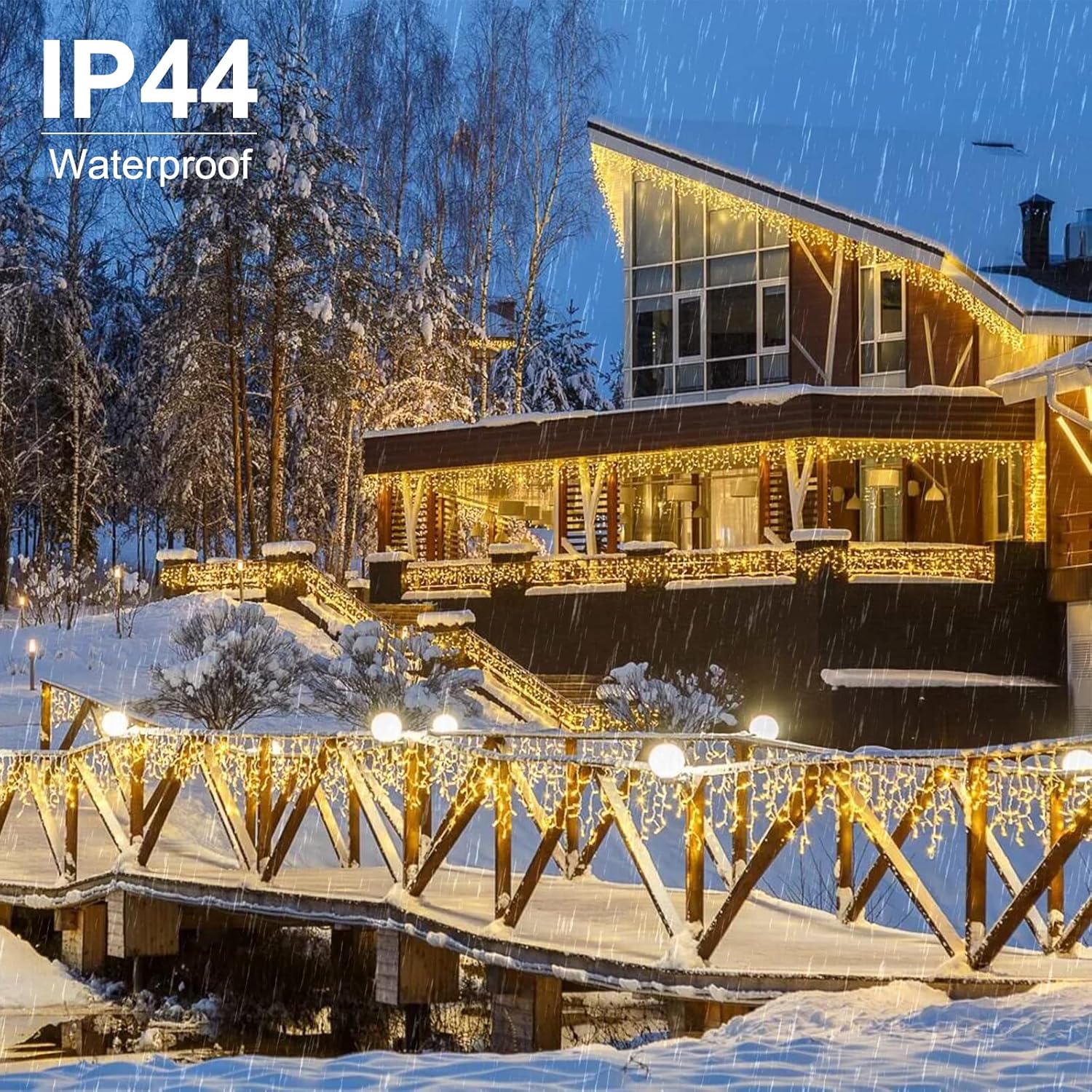 • Commercial Grade: The IP44 waterproof icicle fairy lights is great outdoor Christmas decorations for roof lines, porch fences, railings, window, bedroom, courtyard, balcony, gazebo, canopy, wedding, etc