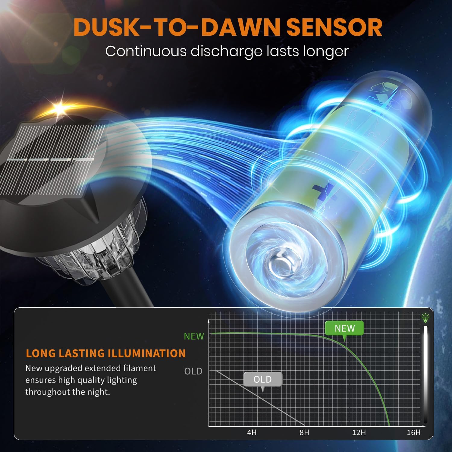 • SOLAR LANDSCAPE LIGHTS: Our upgraded solar pathway lights draw inspiration from the cosmos, boasting a unique and durable construction. The sleek and modern design effortlessly complements the surrounding landscape, creating a lovely ambiance. Bringing a touch of magic to your garden and creates a warm and inviting atmosphere. Solar outdoor walkway lights are designed to provide an attractive pattern, lights up your garden at night.