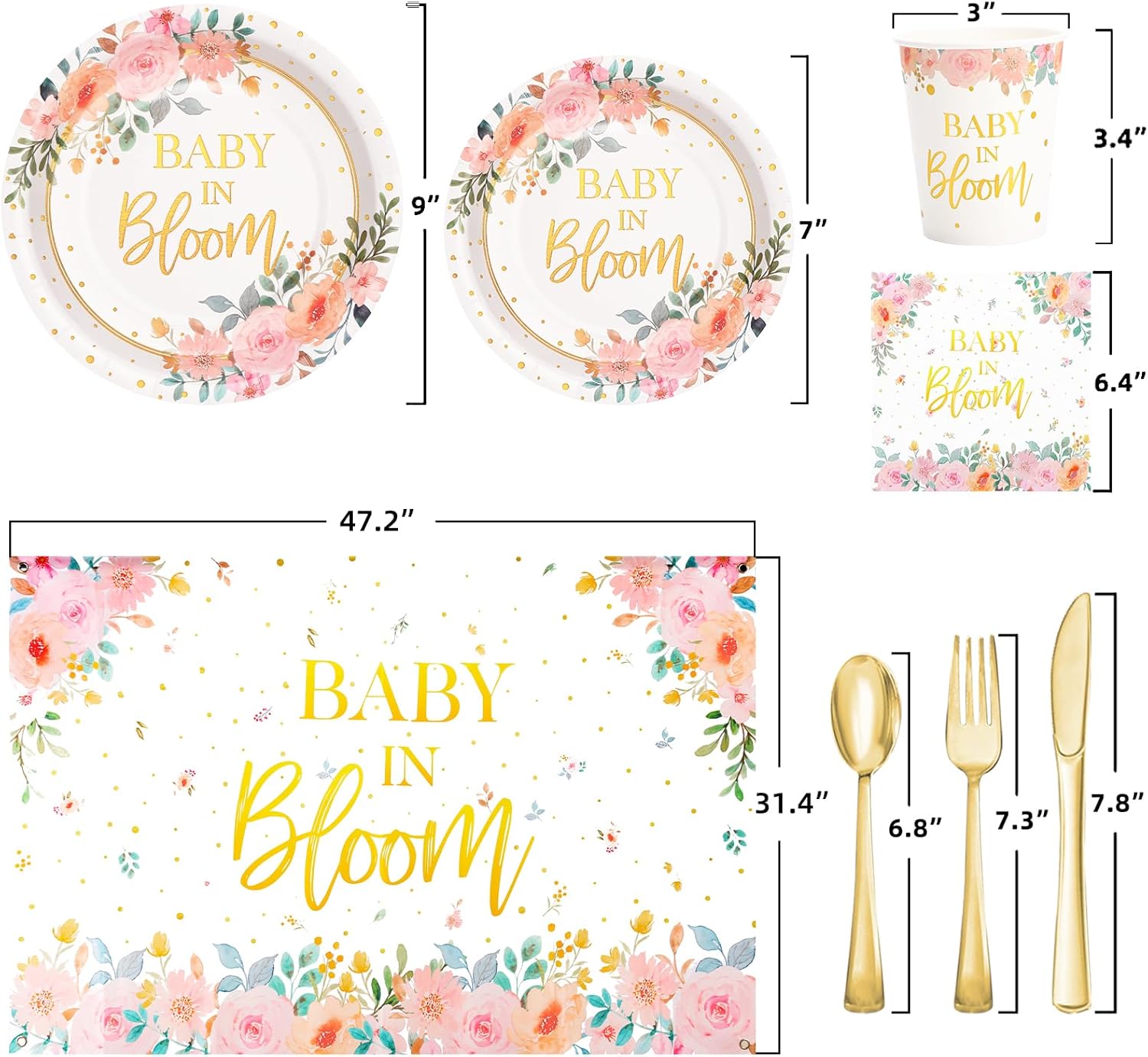 • 【Girl Baby Shower Decorations】- Its a girl baby shower decorations include 24 9 inch floral baby shower plates, 24 7-inch girl baby shower plates, 24 baby shower cups, 24 baby shower napkins, 24 sets of plastic utensils (forks, spoons, knives), 1 47.2*31.5in baby in bloom backdrop, 169 pieces in total.This is a great girl baby shower plates and napkins party supplies.